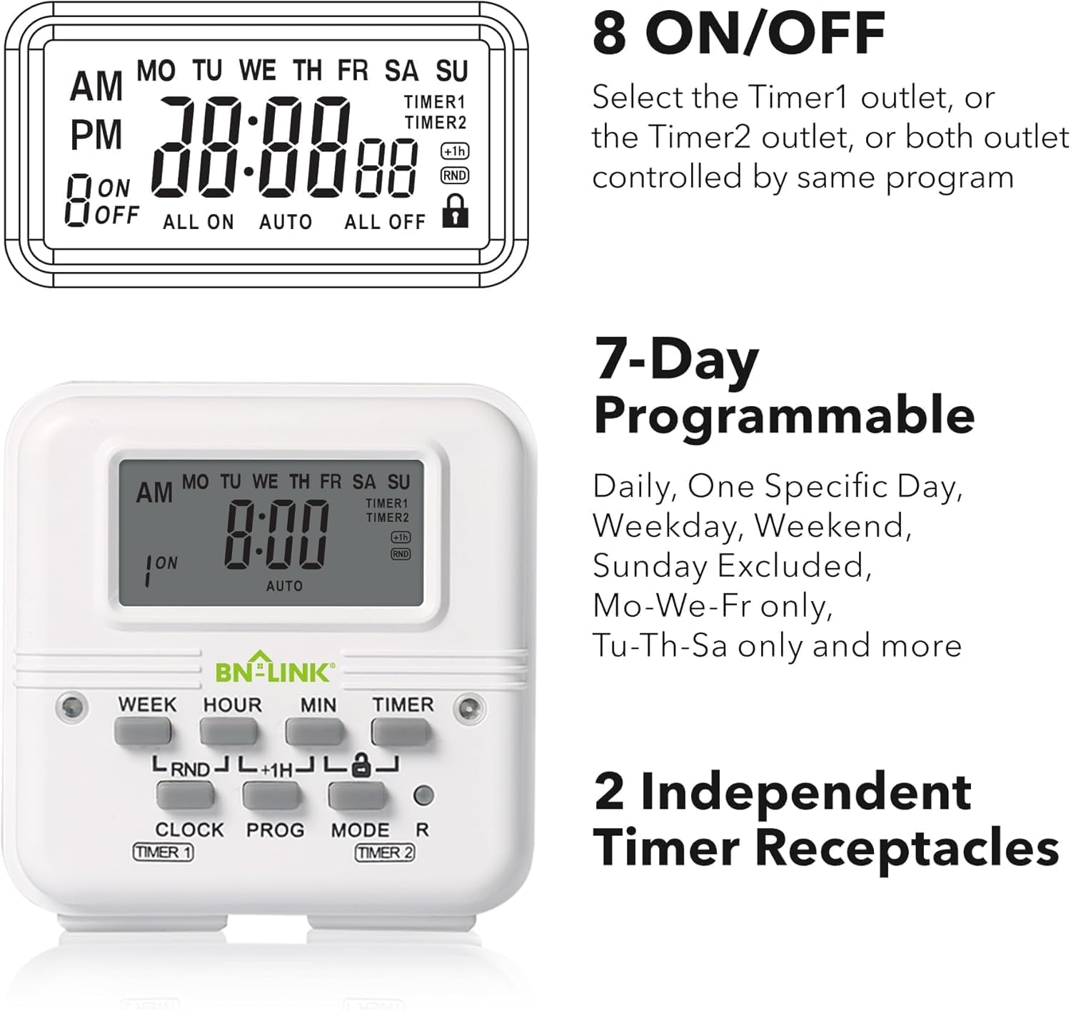 - ă2 Outlets with Independent ControlăThe BN-LINK timer features two control buttons (Mode1 and Mode2), allowing you to manage each outlet independently. You can also sync both outlets to follow the same schedule when needed.
