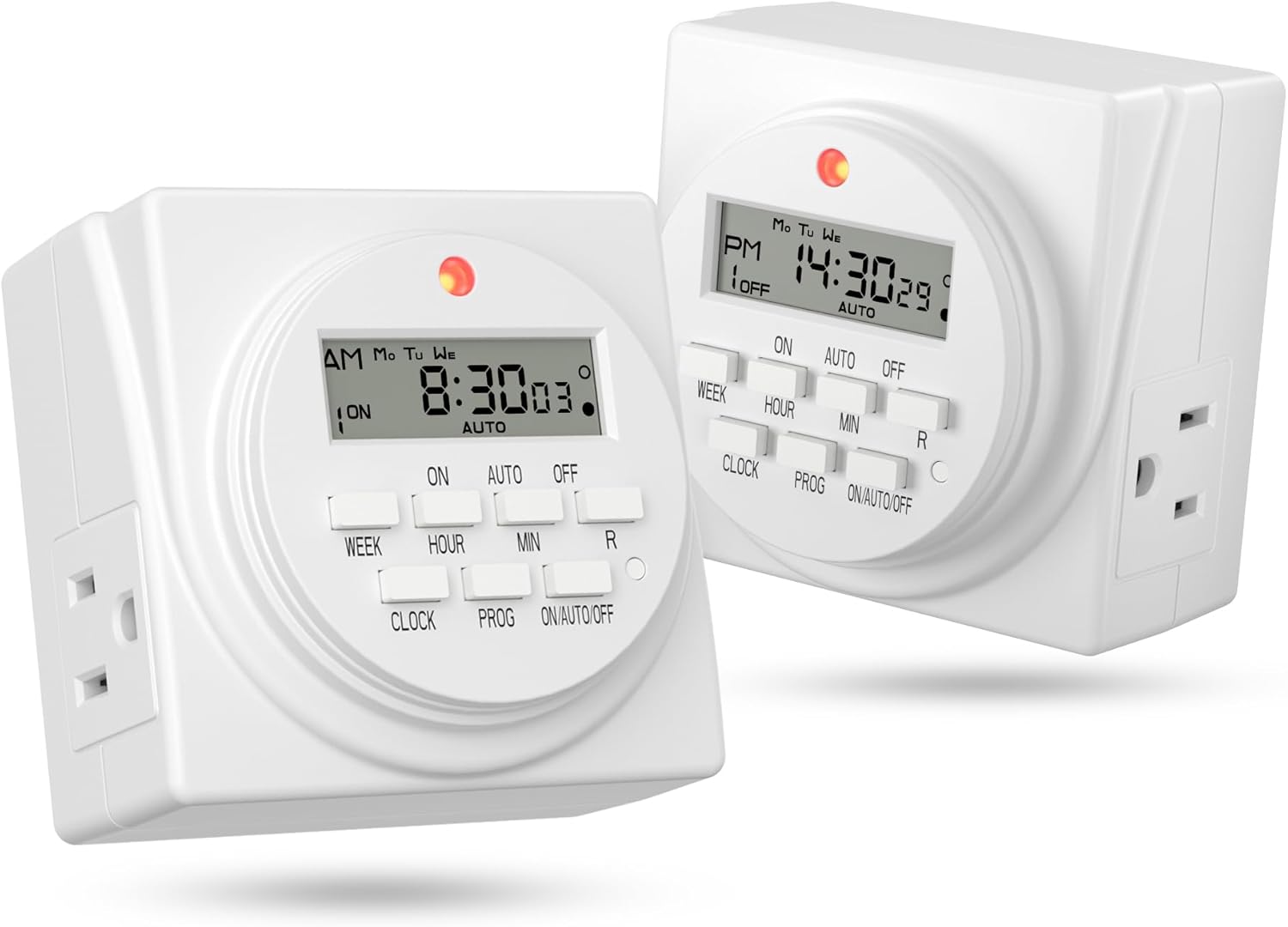 - ✓ VERSATILE & CUSTOMIZABLE: This 2-pack of our classic 3 prong digital timer allows you to easily set up to 8 on/off programs for each timer’s two grounded outlets. Outlets are controlled simultaneously, and settings can be as short as one minute.