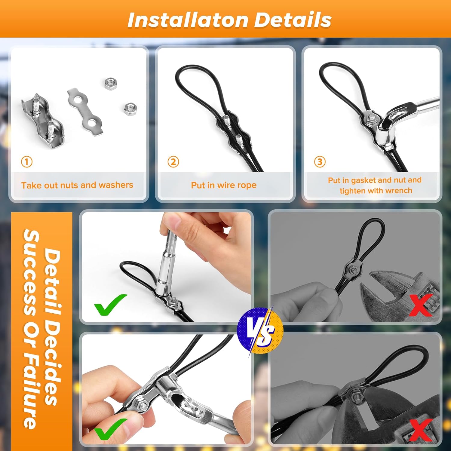 Belio String Light Hanging Kit, Stainless Steel Cable for Outdoor Lights, 182 FT Wire Rope Cable Turnbuckle and Hooks, Globe String Light Suspension Kit