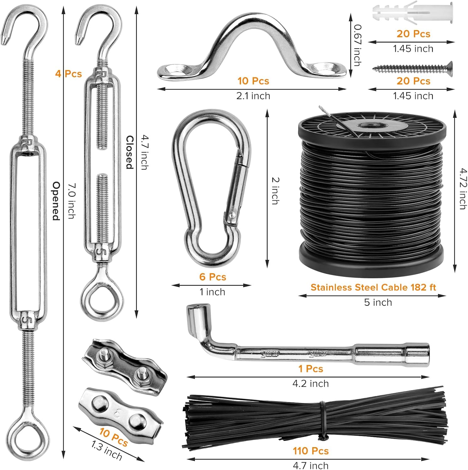 - 【Enough Accessories】:This package provide almost all of the kit you need, including 182 feet length Stainless Steel 304 Cable; 4 Pcs M5 Turnbuckle, 6 Pcs Attached Snap Hook,10 Pcs Eye Straps,10 Double Rope clamps ,20 Pcs Lag Screw, 20Pcs Plastic anchors,130PCS Black Twist Ties, 1*user manual