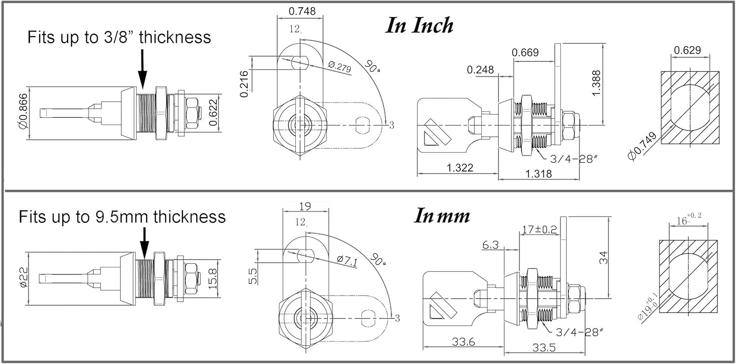 - Fits up to 3/8" (9.5mm) thickness. Please check measurements in photo to ensure which is correct lock for your needs. Order multiple sets and all will be keyed the same (all keys will work with all the include locks)