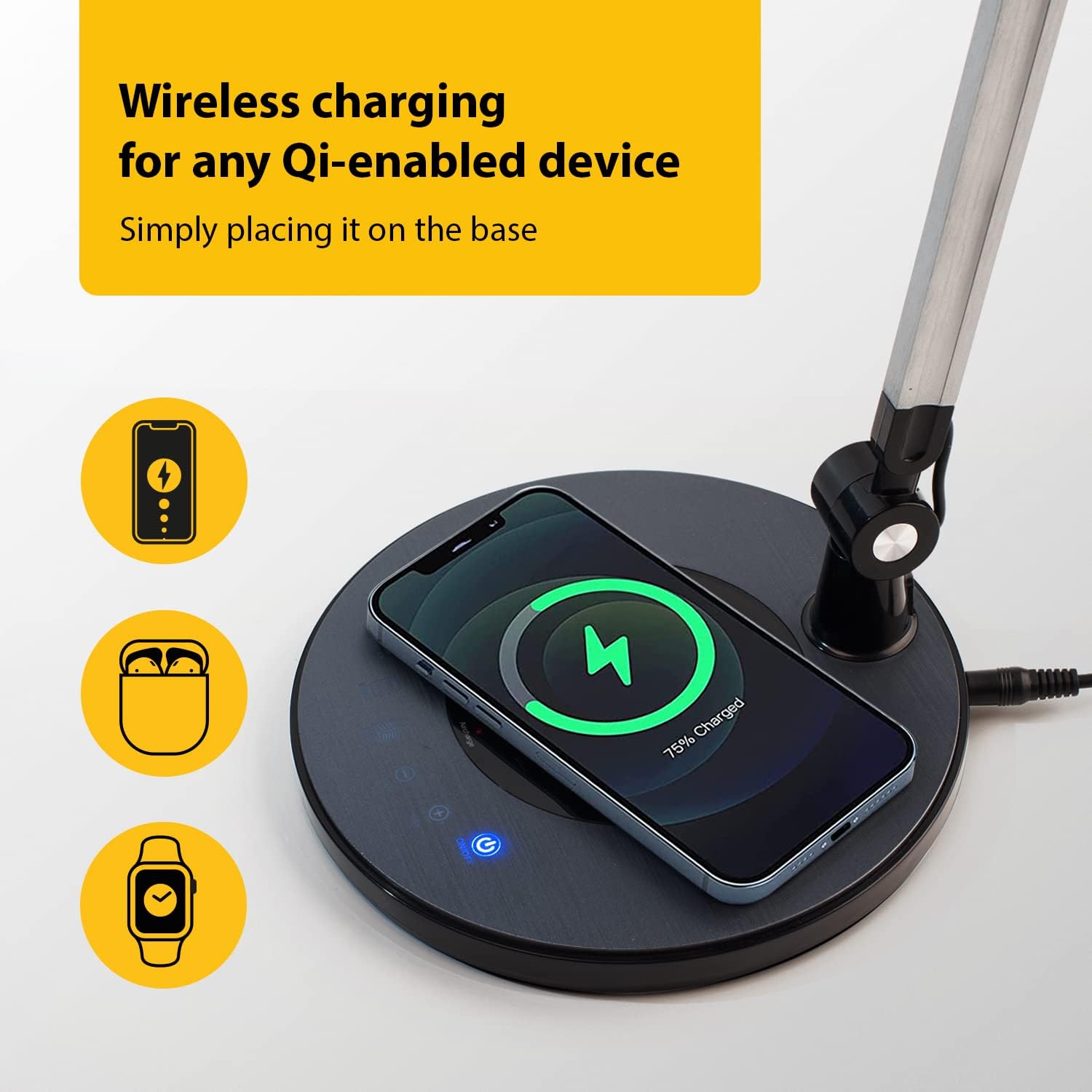 - 2 in 1 Wireless Charger & Lamp – OTUS desk lamp with wireless charger keeps your workspace clean and efficient; Place your phone or earbuds on the lamp base for Qi charging while working, studying, or attending video meetings; No extra cables — just bright, focused LED illumination that keeps you powered all day
