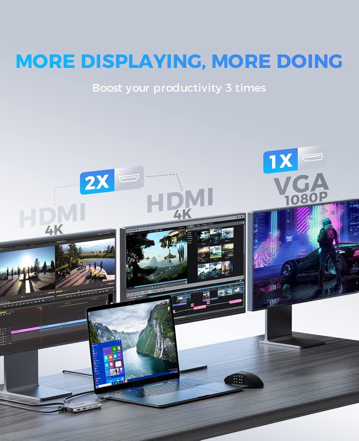 USB C Docking Station Dual Monitor, UtechSmart 11 in 1 USB C Hub Triple Display, Laptop Dock with 2 HDMI, Ethernet, VGA, 100W PD, SD/TF Card Slot, 4USB for MacBook Dell HP Surface Lenovo ASUS