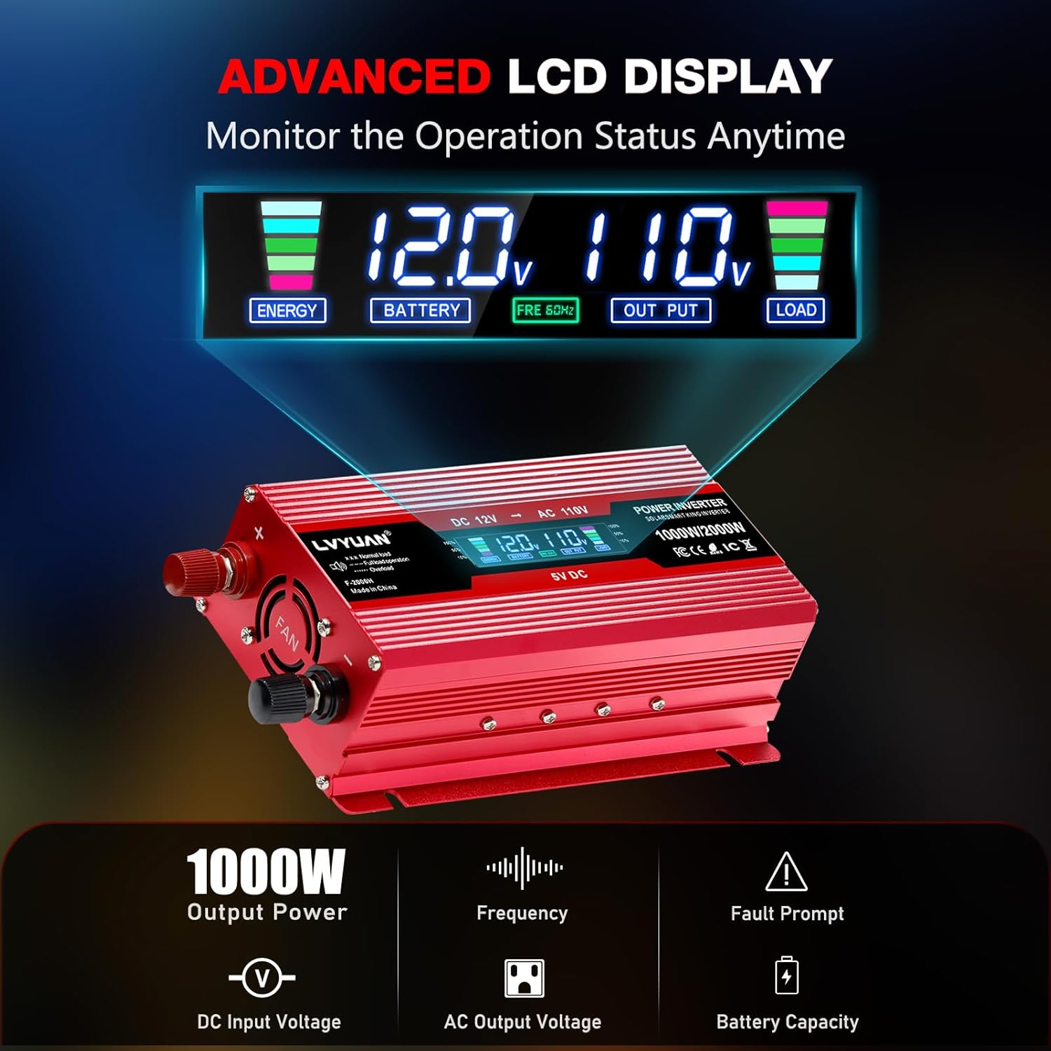 - INTELLIGENT LCD DISPLAY: When the car inverter is working normally, the LCD display will show the input/output voltage, battery capacity, load capacity and output frequency. When the inverter is in abnormal state, the LCD display will show the abnormality code. Such as, E-1: Low voltage protection, E-2: High voltage protection, E-3: Overheat protection, E-4: Overload protection, E-5: Short circuit protection, E-6: Repeated fault shutdown, need to restart