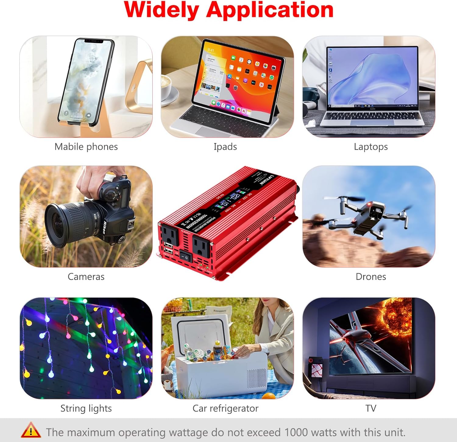 - POWER INVERTER FOR VEHICLES: Converts 12V DC to 110V AC 60Hz, providing 1000 watts of continuous modified sine wave power and a peak output of 2000 watts. It features 2 car outlet adapters and 2 USB ports, making it an excellent choice for essential car accessories