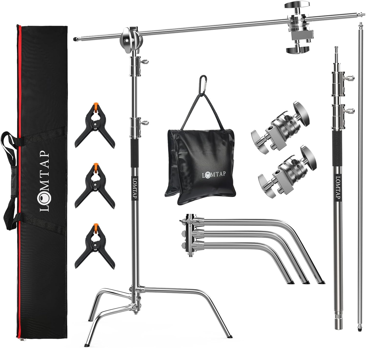 LOMTAP C Stand Light Stand Stainless Metal Photography Kit - Heavy Duty 10.8ft/330cm Vertical Pole, 4.2ft/128cm Boom Arm, Adjustable Base, Water Sandbag, 2 Grip Heads, 3 Clips for Softbox, Reflector