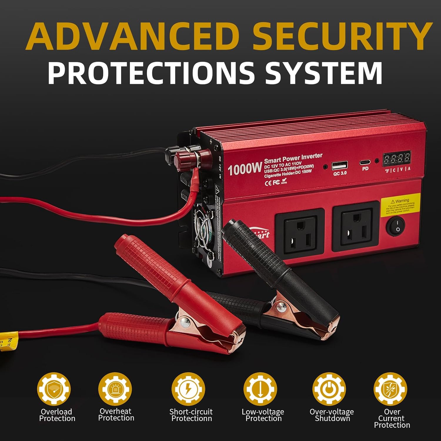 - Safety Multi-Protection 1000W 12V Automobile Inverter :Cooling Fan,Smart Digital Display, and Mini Slip Fuse to protect against Over Voltage, Low Voltage,Overload ,Short Circuit, Over Heat. Applies the technology of ABS crashworthiness, robust, as well as good electrical insulation auto inverter