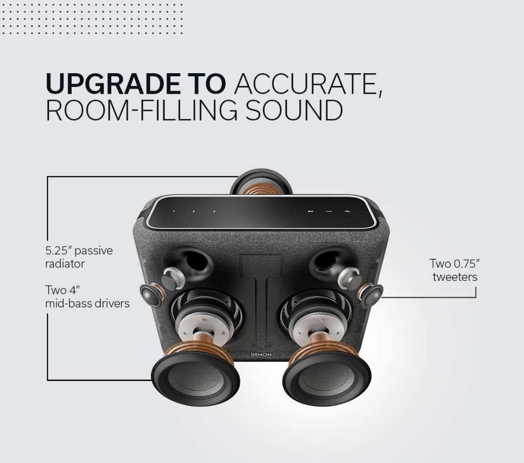 - HI-RES AUDIO, WITHOUT THE HI-FI SYSTEM – Featuring (2) dynamic 0.75" tweeters, (2) 4" bass drivers, a 5.25" passive radiator & sound master tuning, the Denon Home 250 gives you clear highs & deep lows for an exceptional sound quality from a single speaker