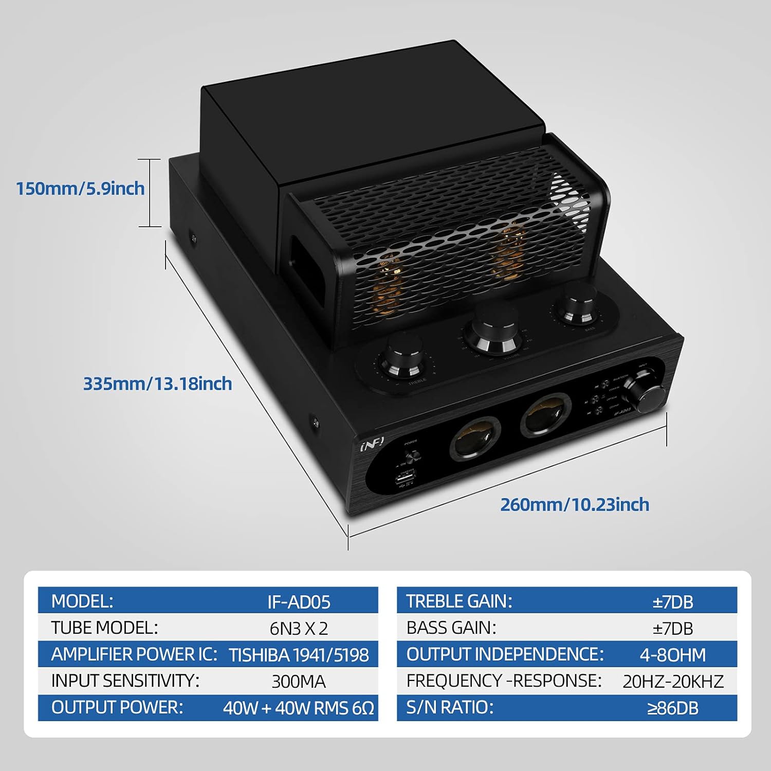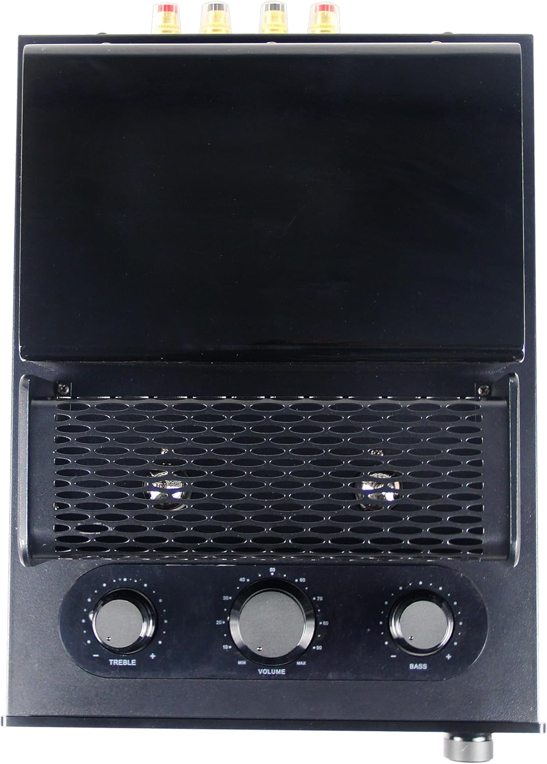 - 120W Hybrid TUBE AMPLIFIER: 60W x2 6 ohm / Channel. Front Panel has independent Treble/ Bass/ Volume adjustment Knob. Supplied with a replaceable tubes.