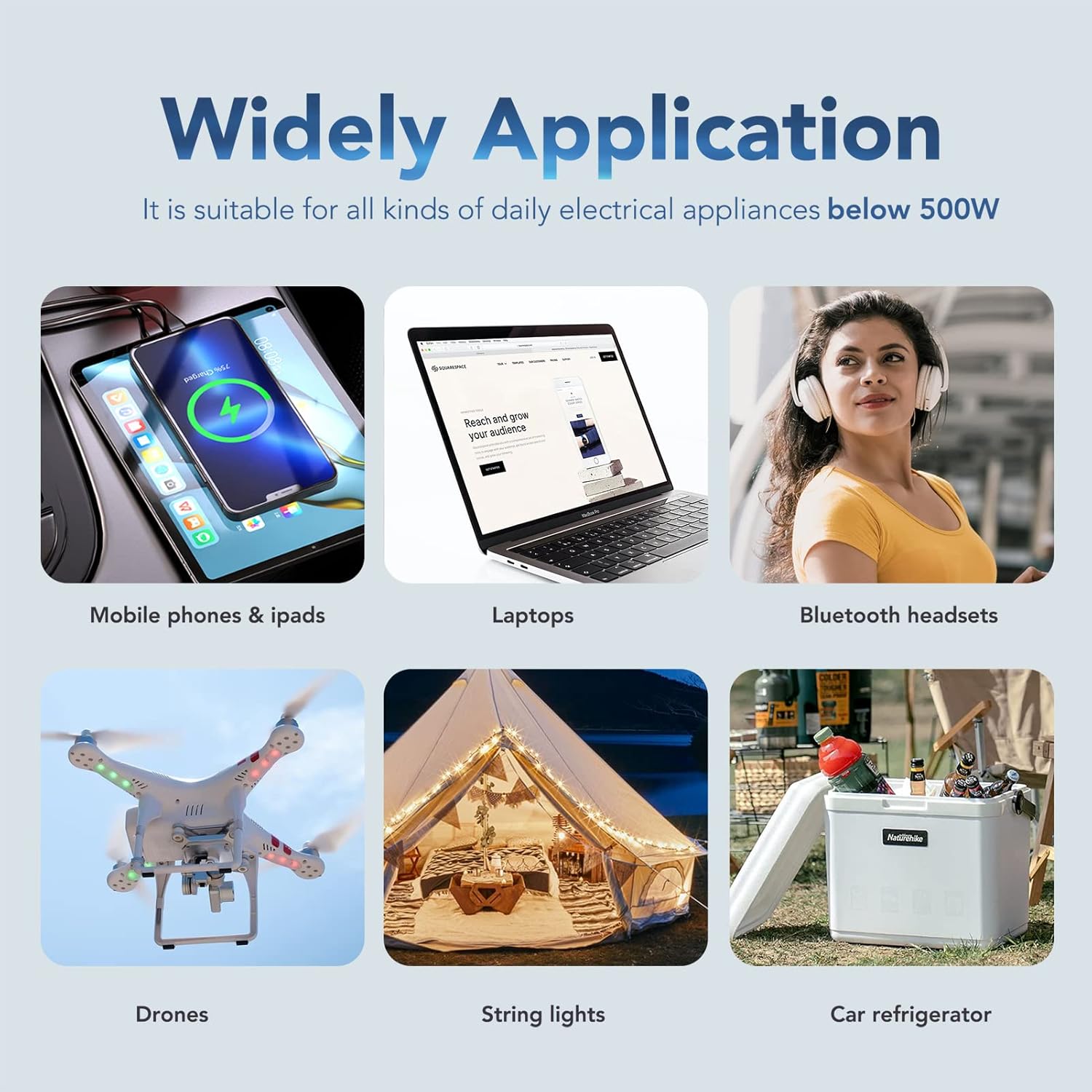 - 500W Power Inverter:Provides 500 watts continuous DC 12Volt to AC 110Volt power and 1000 watts of peak power, featuring 2 AC outlets and 2 USB quick charging ports. Great for charging string lights, laptop, game console, kindle, DVD player and electronic devices.