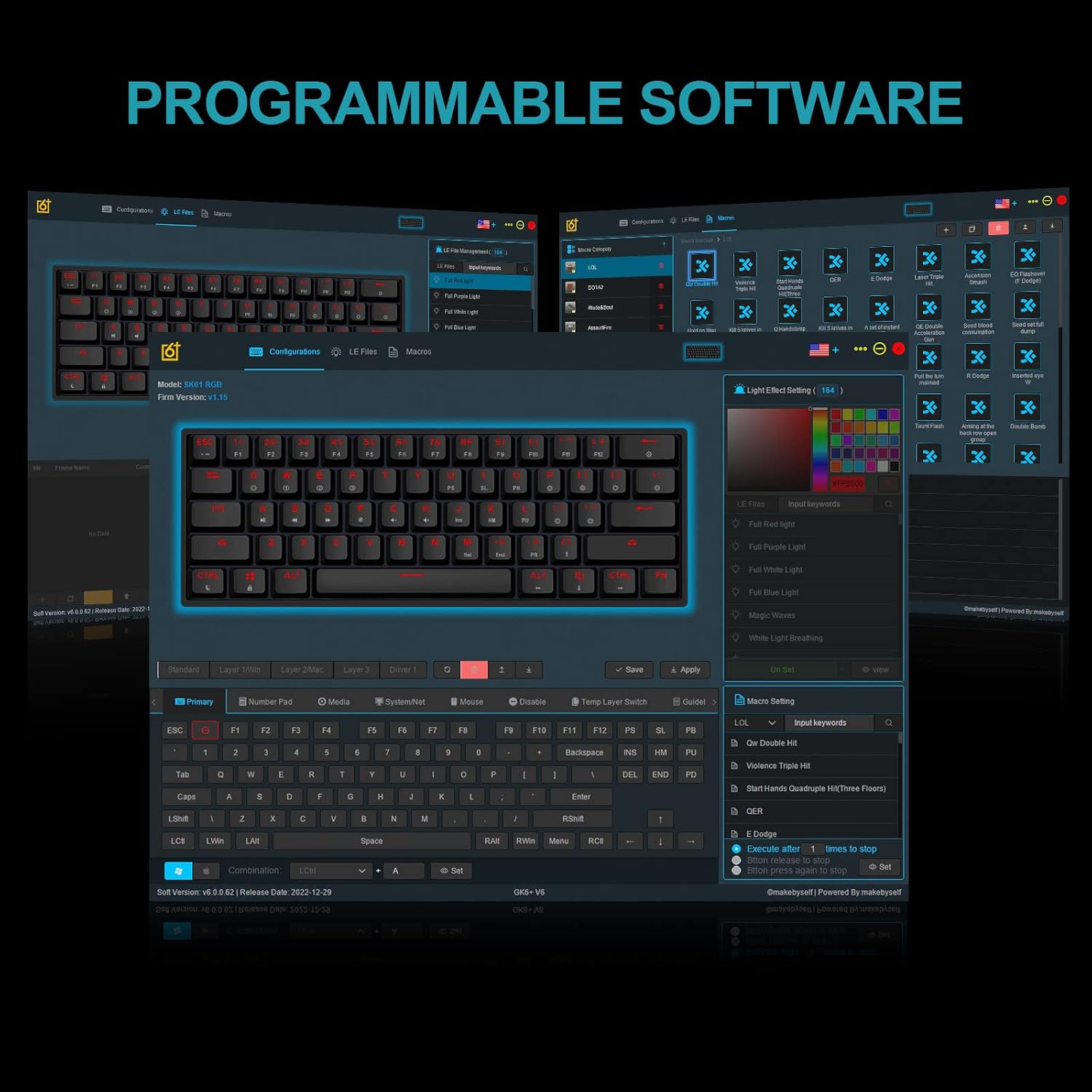 - 【Professional 5 Chips RGB Keyboard】SK61 is 60% layout but also with amazing functions. The chipset is 32 Bit M3 host MCU + 8M Flash on-board storage, and 3 pieces of independent 256*256*256 RGB color management chip. You even got the musical rhythm lighting effect with this. Compact but also professional