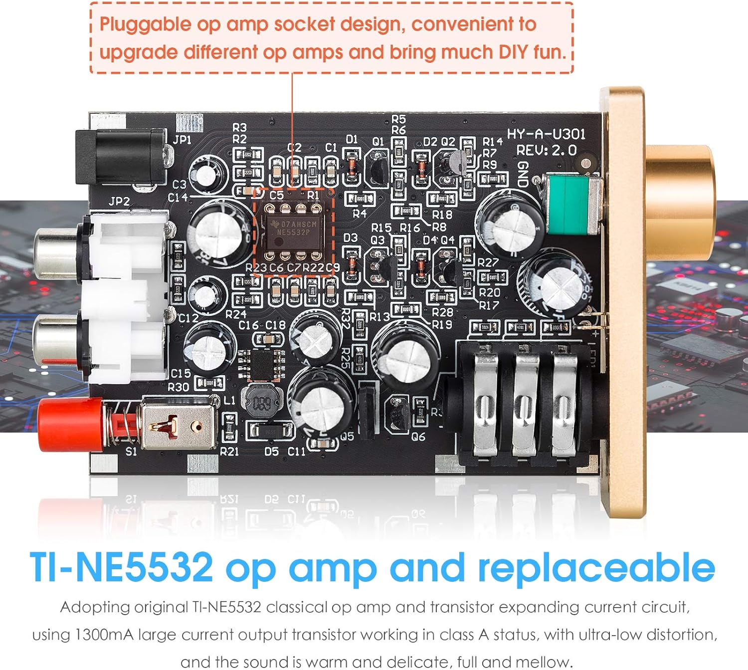 - Adopting original TI-NE5532 classical op amp and transistor expanding current circuit, using 1300mA large current output transistor working in class A status, with ultra-low distortion, and the sound is warm and delicate, full and mellow.