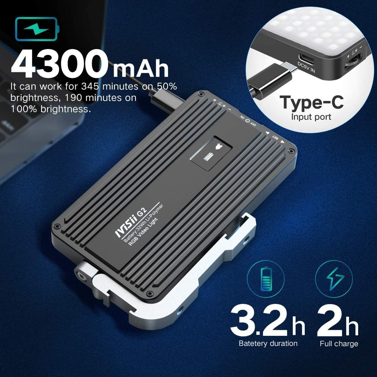 - 【4300mAh Hightly Capacity Rechargeable Battery】Built-in 7.7V 4300mAh rechargeable battery, USB Type-C charging port, supports to 345 mins working time at 50% power and 190 mins working time at full power.