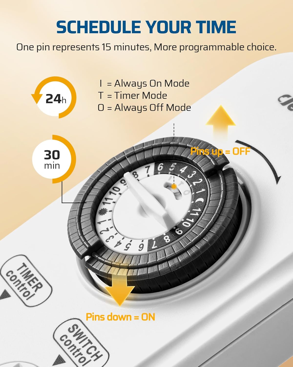 - EASY TO SET MECHANICAL TIMER - Schedule your devices at a minimum of 30-minute intervals in a 24-hour cycle, pins up means off while pins down means on, the power strip timer will repeat daily at your scheduled time