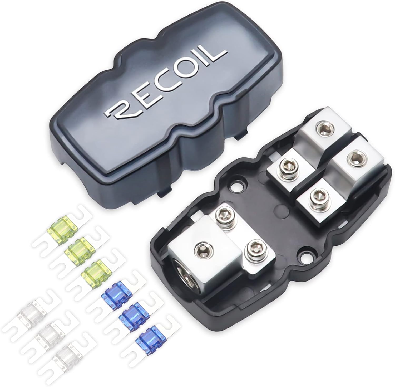 Recoil MFH12 2 Way Mini-ANL Fused Distribution Block, 1 X 0/2/4 Gauge in / 2 X 4/8 Gauge Out Fused Distribution Block with 60A, 80A, 100A Fuses, Solid Brass for Maximum Power Transfer