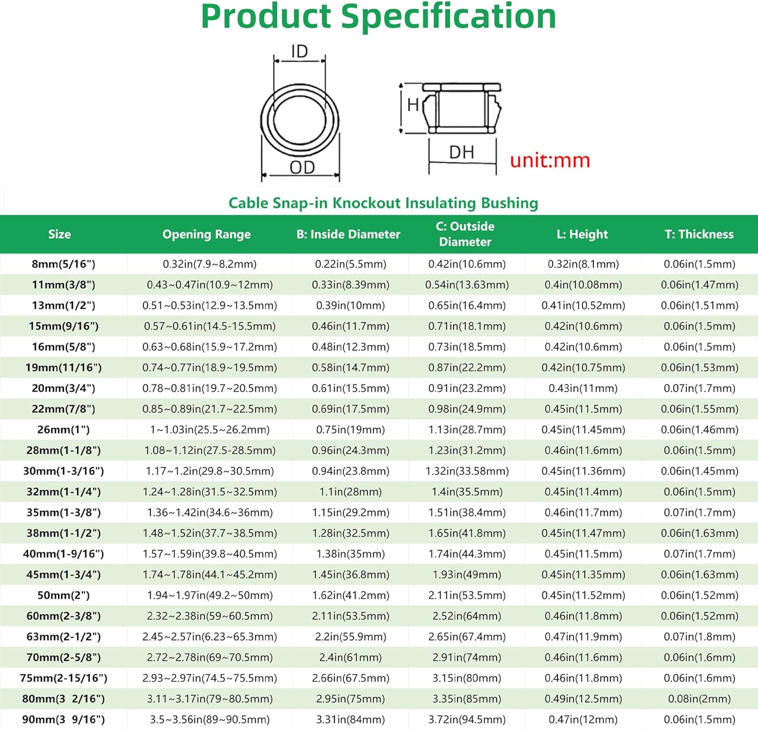 - PACKAGE&SIZE: You will got 20pcs of black snap-in knockout bushing for this package with Mounting Dia: 1"; Fits hole diameter: 1~1.03in(25.5~26.2mm); Inner Dia: 0.75in(19mm); Outer Dia: 1.13in(28.7mm); Height: 0.45in(11.45mm)