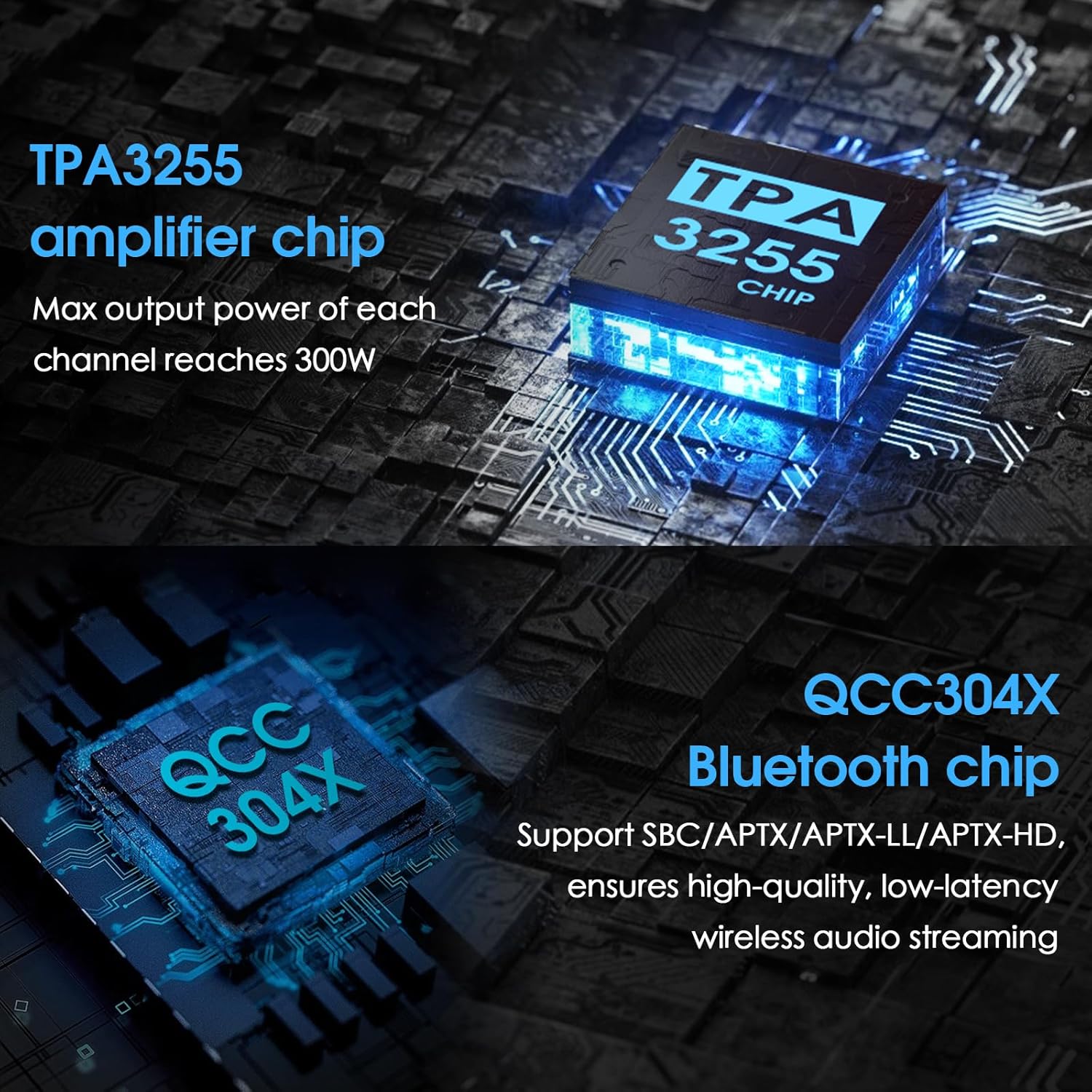- High-quality audio components: with TPA3255 amplifier chip adopted, max output power of each channel reaches 300W, can drive most home passive speakers and delivers exceptional sound quality with low distortion. The QCC304X Bluetooth chip, supporting SBC/APTX/APTX-LL/APTX-HD etc, ensures high-quality, low-latency wireless audio streaming with efficient power use and stable connectivity.