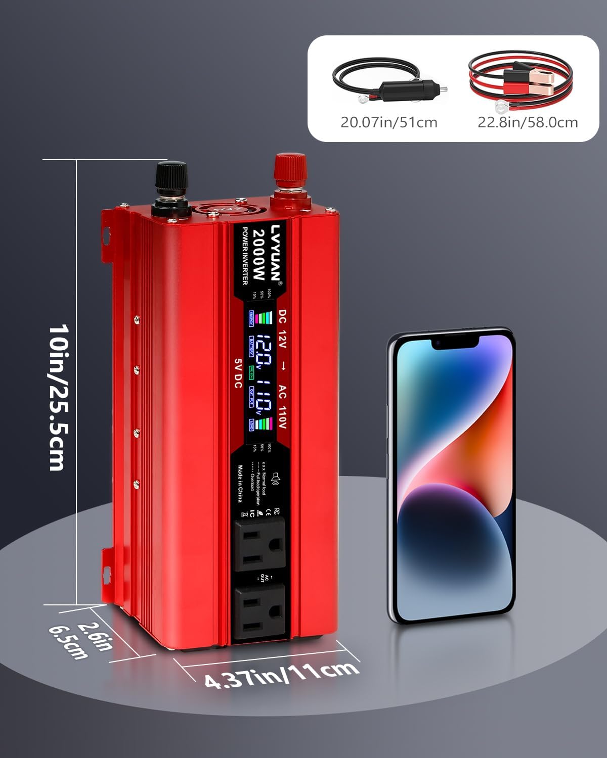 - SPECIAL DESIGN: Built-in temperature control cooling fan. 2pcs battery clips and 24 inch cigarette lighter plug come along with the power inverter, they make the power inverter can be plugged into almost any vehicle. Durable aluminum body provides advanced protection and easier to cooling.