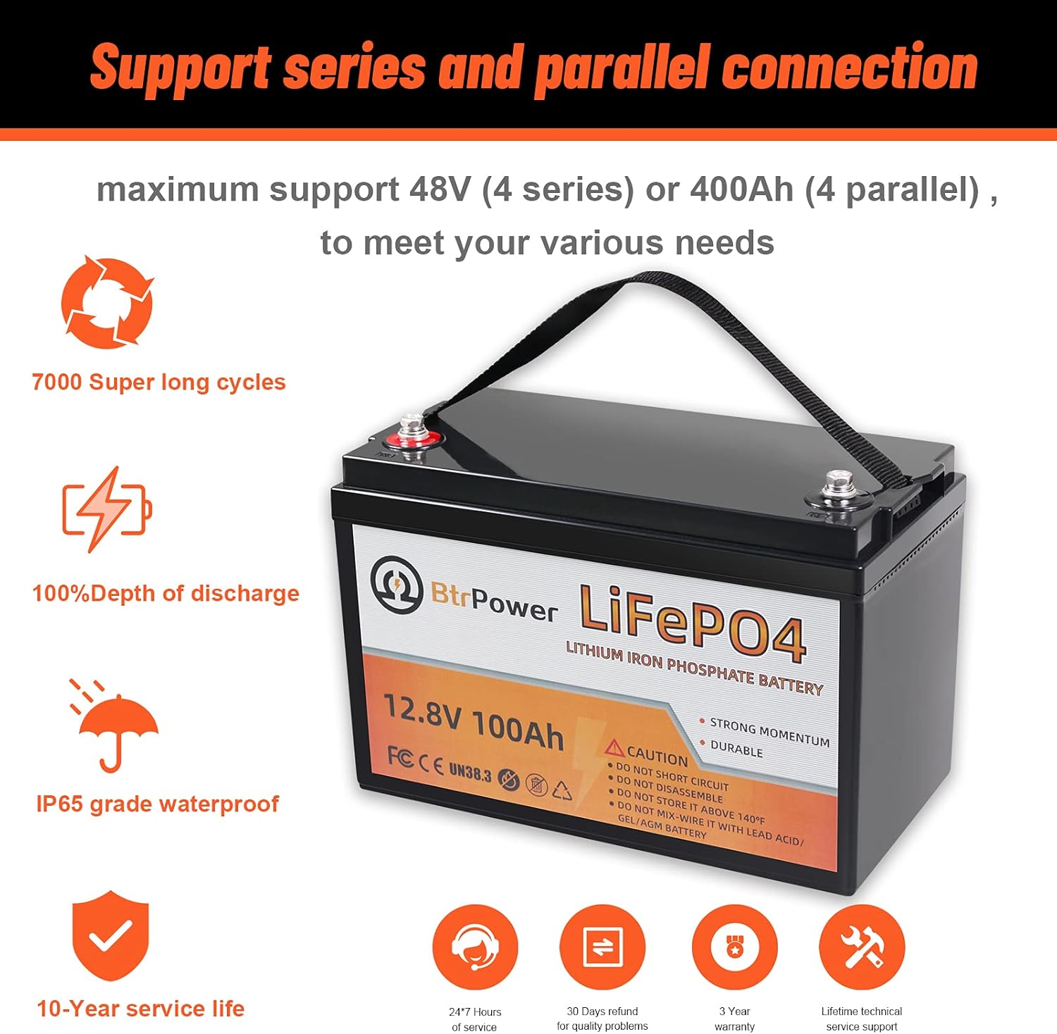 - 【Double capacity of 2560Wh】12v 100ah LiFePO4 battery possesses industry-leading technology . This model has excellent and reliable . 2 packs batteries can consist a system of 2560Wh and suitable for electric energy storage.