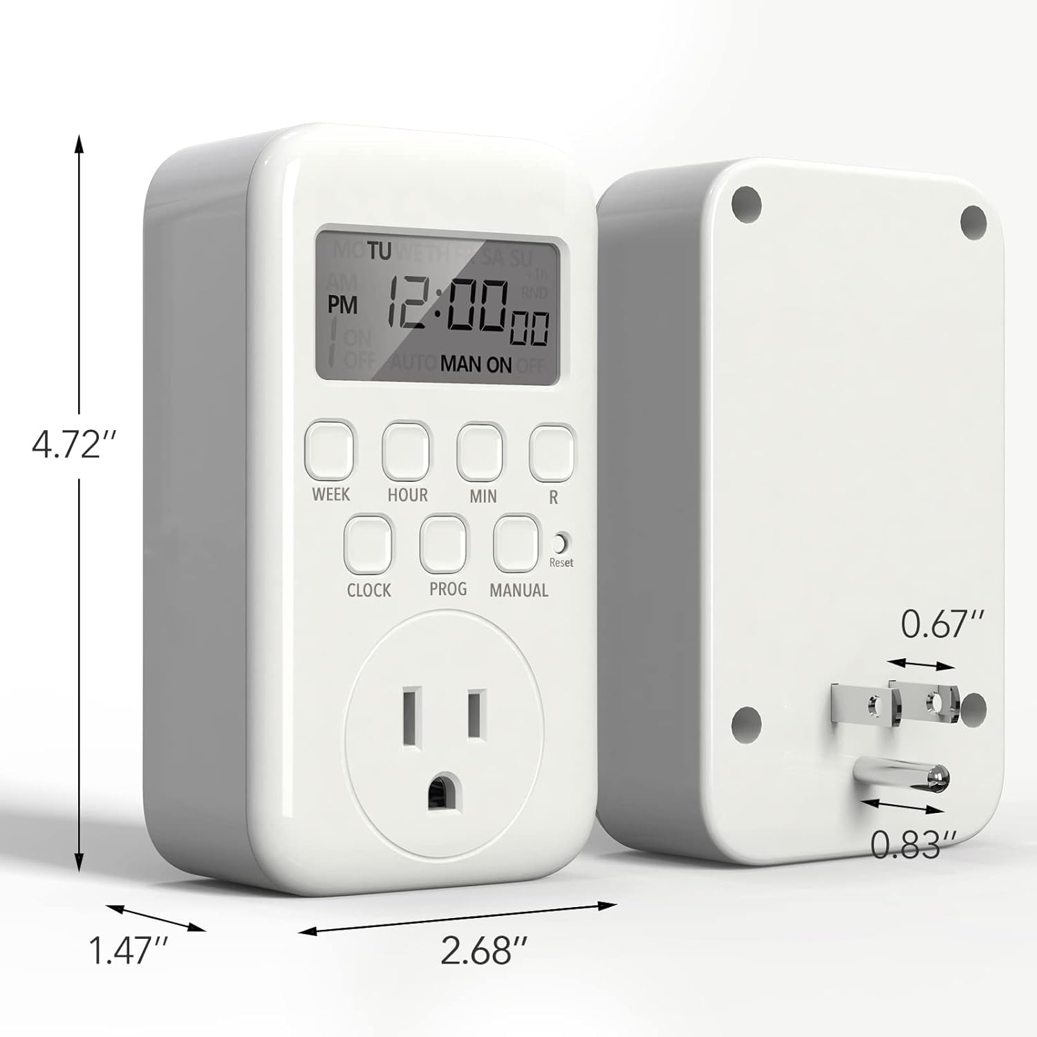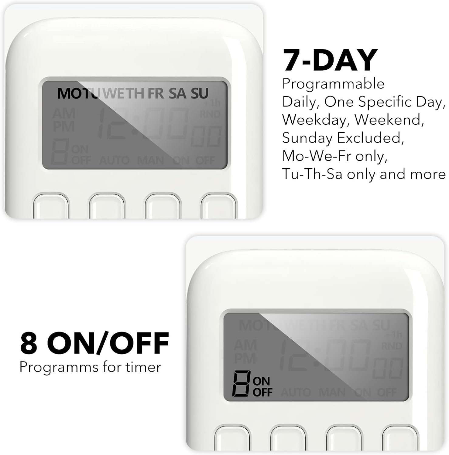 - ✓ Versatile & Customizable: This indoor timer features flexible buttons and a large, clear display screen. Easily program up to 8 on/off schedules for the 3-prong grounded outlet timer. The setup is straightforward, with settings as short as one minute.