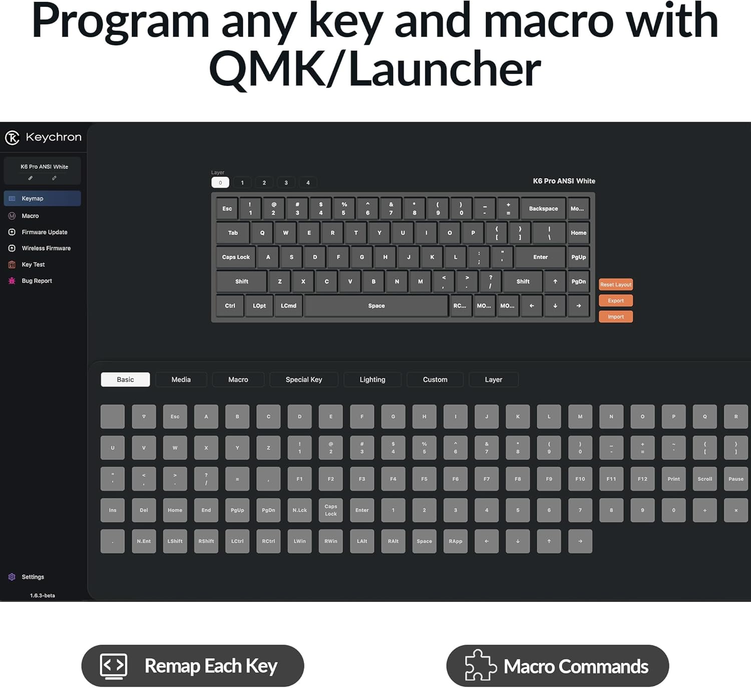 - Program keys with Launcher- Anyone can master any keys, macro commands or combination keys through Launcher web app with ease. Simply connect the K6 Pro to your device with a cable, drag and drop your favorite keys or macros to remap any key you want on any system (macOS, Windows, or Linux). *Note: User can remap a key on wired mode only. Once it's done, the keymap will work on both wireless and wired modes.