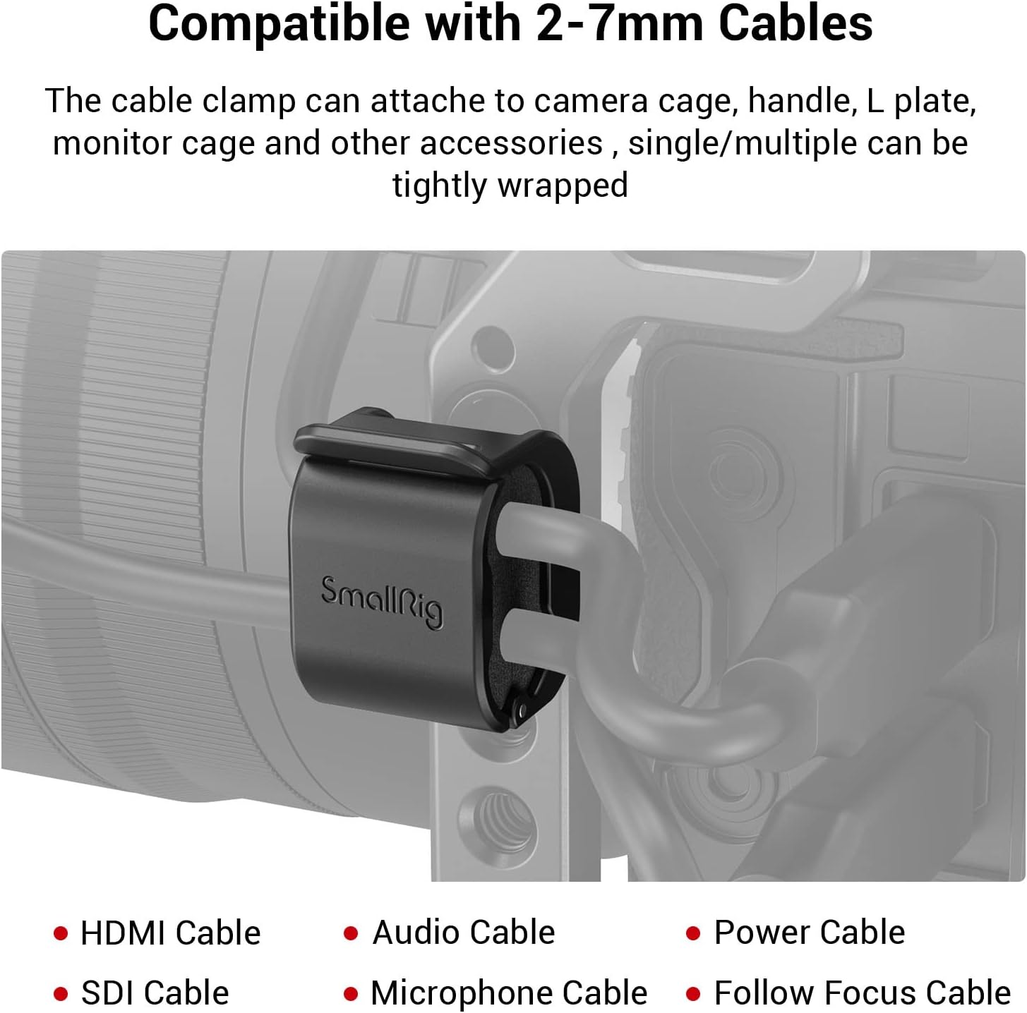 - [Camera Cables Regularize] The camera cable clamp is design to fix disordered cable, facilitates shooting and aviod cable obstruction, it attaches to camera cage, handle, L plate, monitor cage and other accessories through 1/4''-20 screw