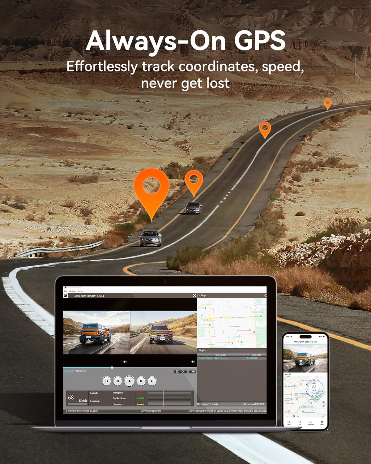 - 64GB CARD & GPS INCLUDED: You can use the dash cam directly without having to purchase any additional accessories. The GPS and exclusive WOLFBOX Player features allow you to display your driving direction, speed, position, and route. This information could potentially serve as important evidence in the event of an incident