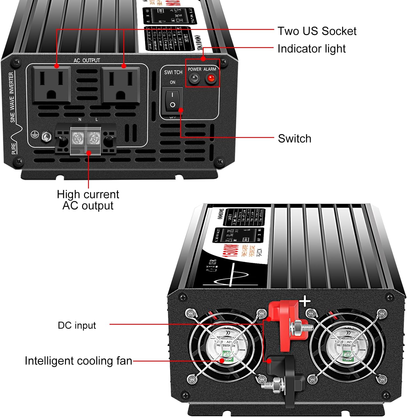 - [Protection] Over voltage, Low voltage, Overload, Short circuit, Over heat, polarity reverse protection(fuse),it will not drain your battery dry because of an under-voltage protection point.The PCB thickness is 2.00mm, allow the stronger current floating on the circuit, increase the load capacity. High frequency transformer to transfer 72V DC to AC 120V, ensure the stable and full AC output.