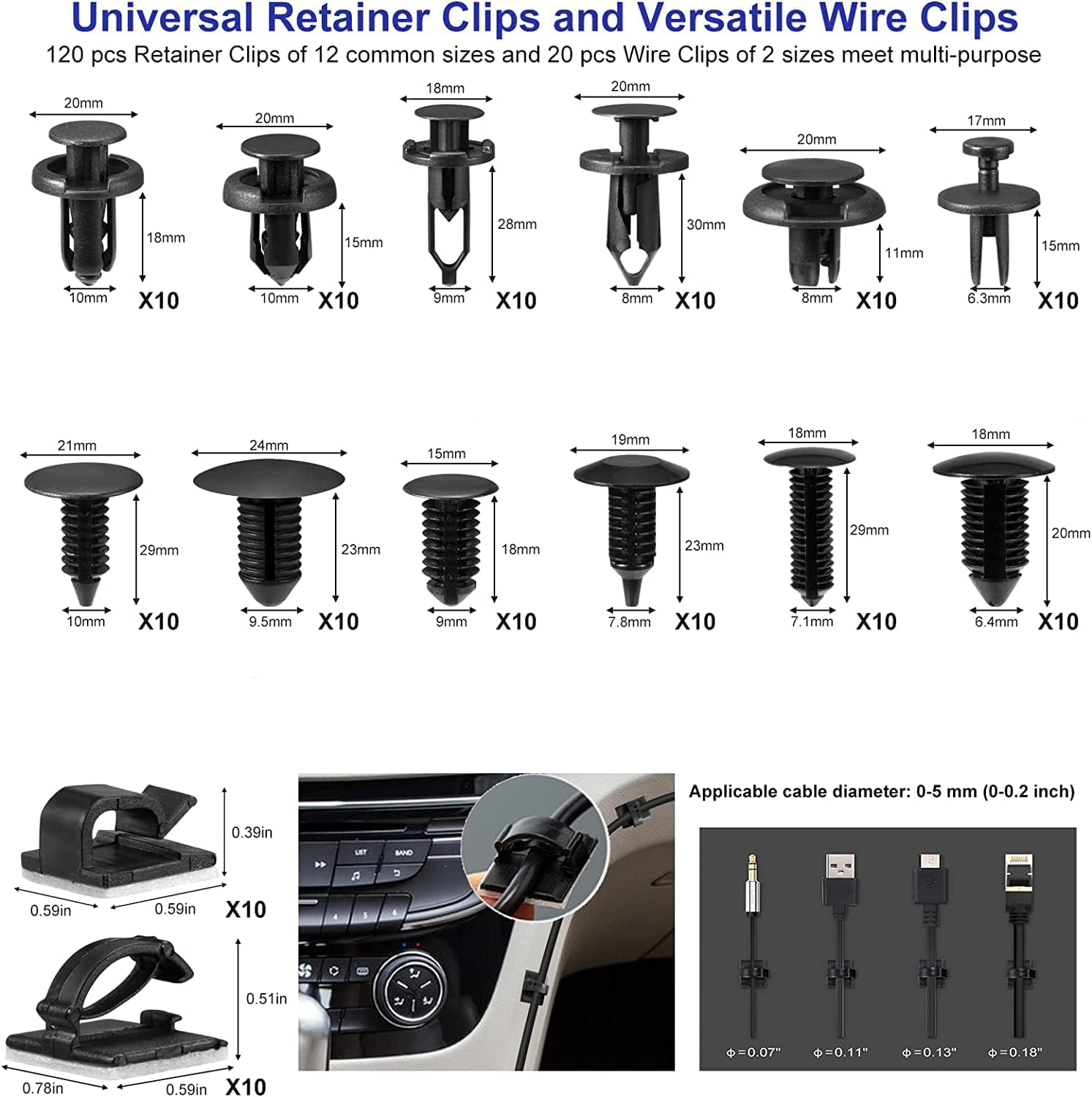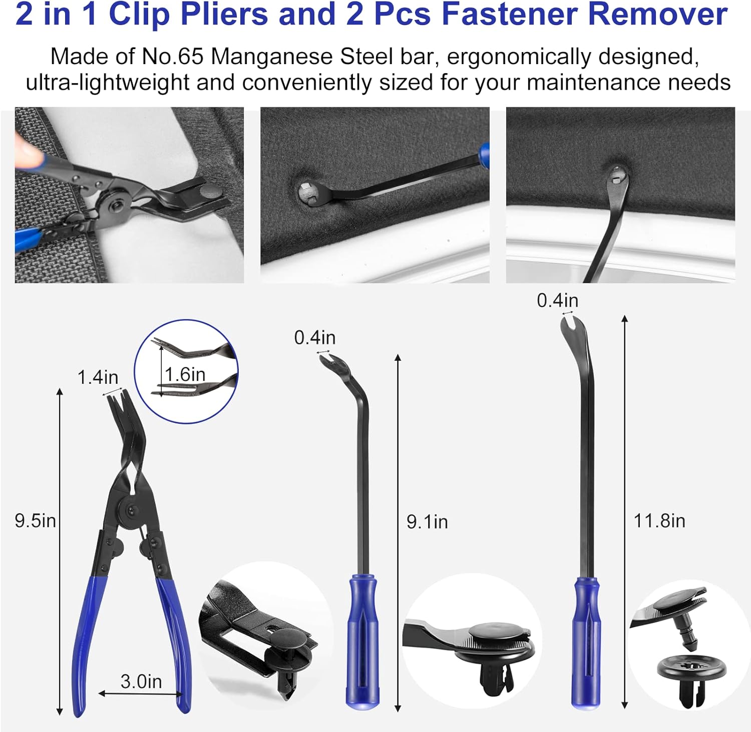- [FASTENER REMOVER SET WITH 120PCS RETAINER CLIPS] Made of No.65 Manganese Steel bar, PPE handle, ergonomic design for comfortable handheld, great for many types of round and square clips, stubborn clips, fasteners, staples, plastic rivets etc; 120pcs car retainer clips with 12 size made of high-quality specail plastic material. Suitable for door trim, bumper, radiator shield yoke, fender, splash shield retainers replacement for Chrysler, Toyota, Ford, Nissan, Honda and more