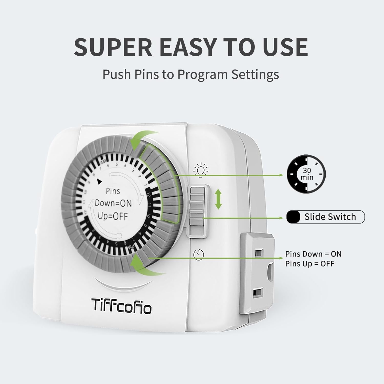 - 【Easy to Use】: No complicated programming required, just pull the pins up for OFF time, and push down the pins for ON time, the timer can automatically control your device for your setting time, save your time and energy.
