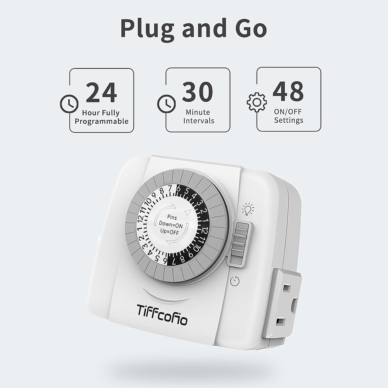 - 【Daily Repeating Light Timer】: 48 ON/OFF setting options in 24 hours; each pins means 30 minutes interval; daily repeat your setting.