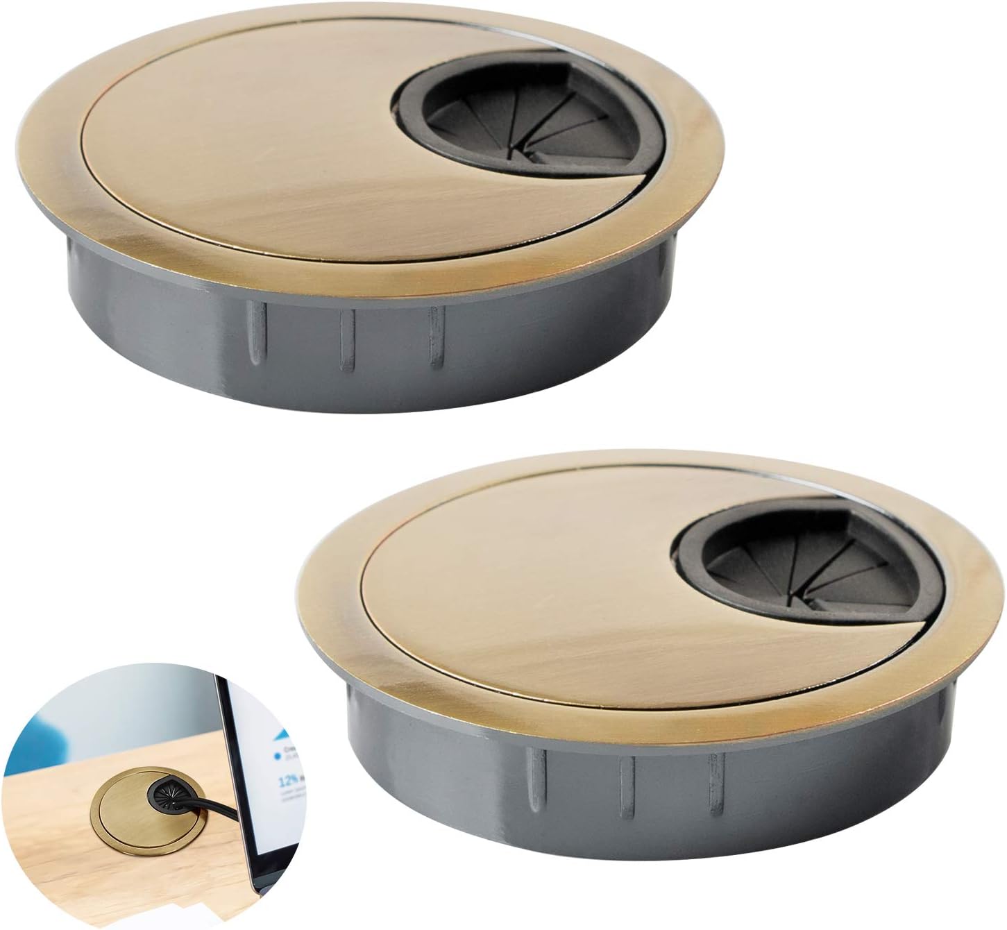 Desk Grommet for Wire Organizer,PC Computer Desk Plastic Grommet Cord, Tidy Cable Hole Cover Organizers,2 Pack (53mm, Gold)
