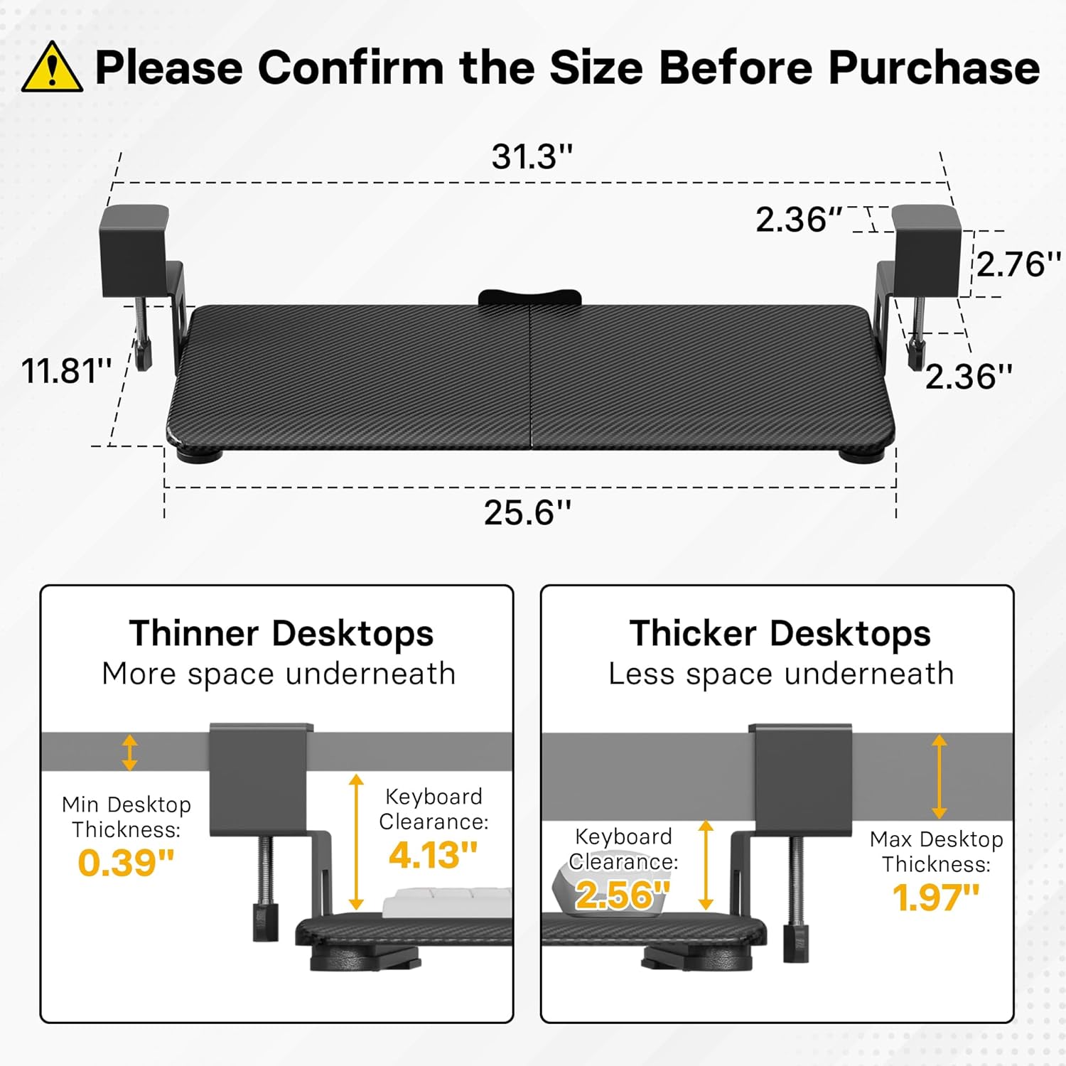 - ❗️ CHECK DESK COMPATIBILITY BEFORE PURCHASE – This under-desk keyboard tray won’t work with desks that have curved, beveled, or rounded edges, or crossbars/support beams underneath. Please check the product images to ensure your desk has a flat, unobstructed underside for clamp installation