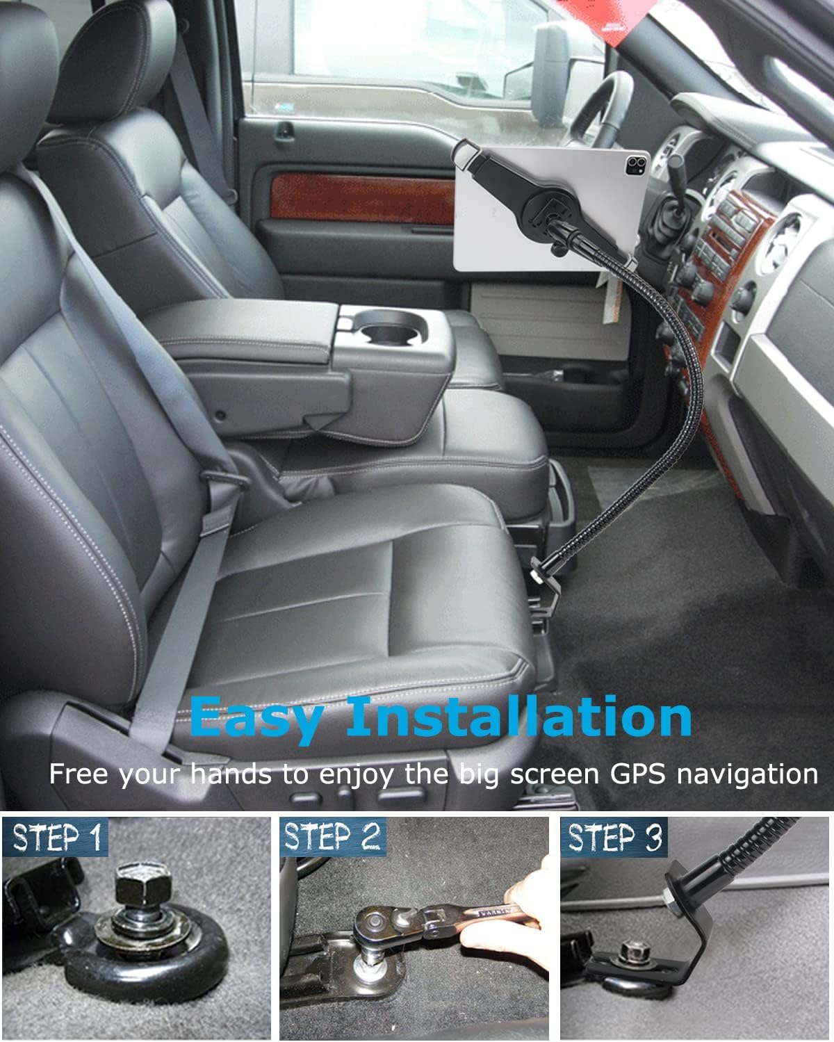 - ăSuitable for Large VehiclesăSteel coil 19.7 inch gooseneck firmly connected to most passenger seat rail bolts. Steel keeps the device firmly in place with low vibration while allowing it to be quickly and easily repositioned. This ultra-long metal arm makes it very suitable for use in large vehicles such as heavy duty truck, pickup truck, work truck, semi truck,Taxi, SUV and ect.