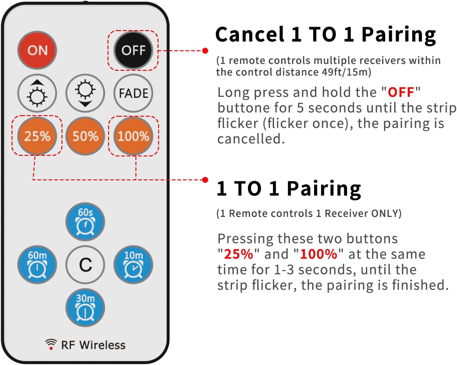 - [Remote Function] - With the RF remote control, there are 11-level brightness dimmer (5%-100%),fade modes, 3 pre-set adjustable brightness(25%,50%,100%), and 4 timer setting, you can control the LED strip light within 15m/49ft in open area. You can use one remote to control 3 receivers simultaneously.