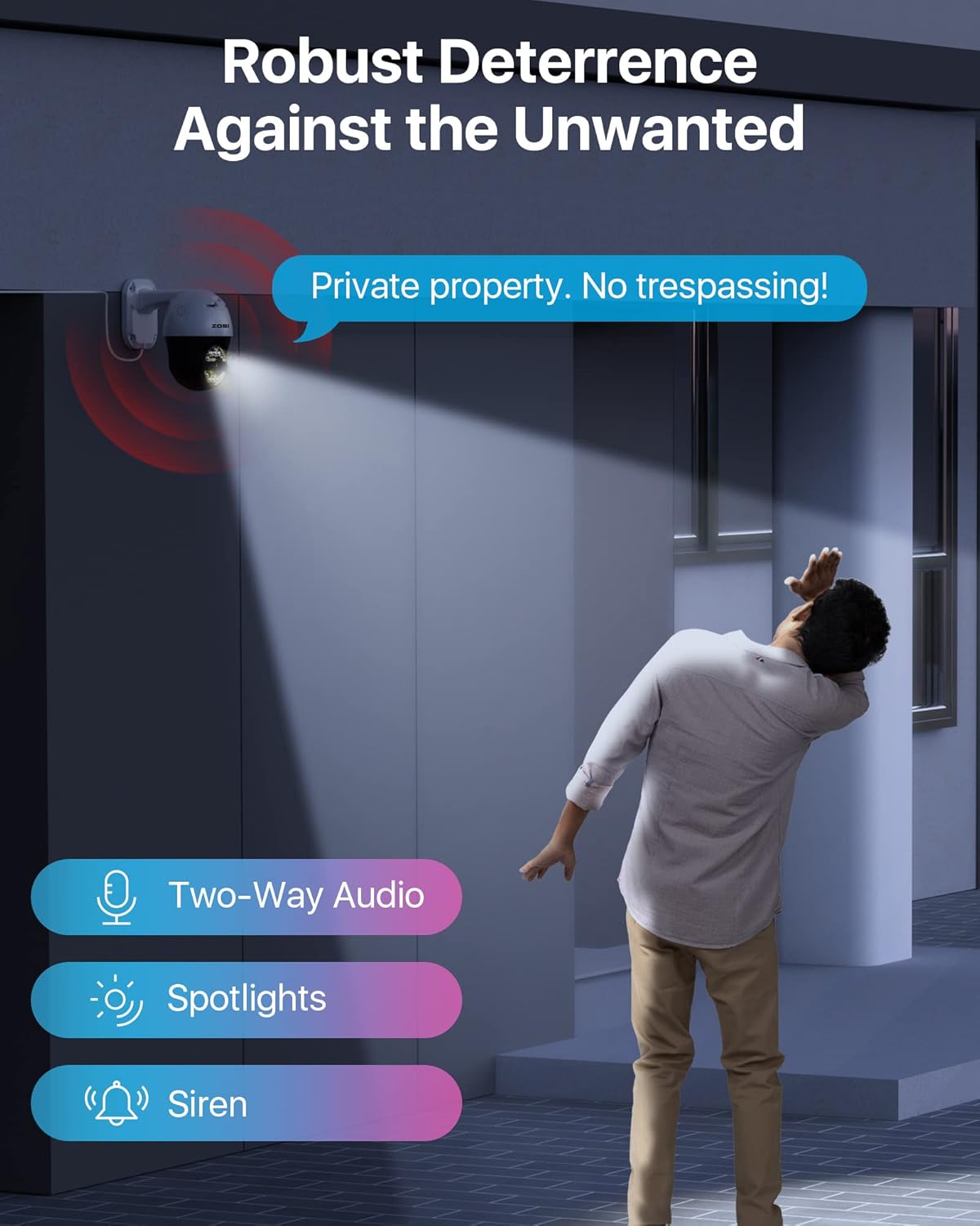 - (1). [ AI Get Smarter Alerts that Matter ] __ Enjoy smarter AI detection capabilities, including face, people, vehicle, sound, pet, and package detection, which reduces false alarms effectively. You can also customize the specific areas where your camera detects motion to receive notifications that matter most to you. Additionally, the camera automatically activates a sound and light alarm when motion is detected, and sends prompt email and push notifications directly to your mobile device.