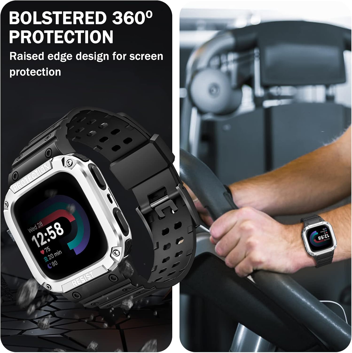 FINTIE Bands with Case Compatible with Fitbit Versa 4/3/2/1/Versa Lite/Fitbit Sense 2/Sense, Protective Case Strap Rugged Sport Band Men, Black/Silver