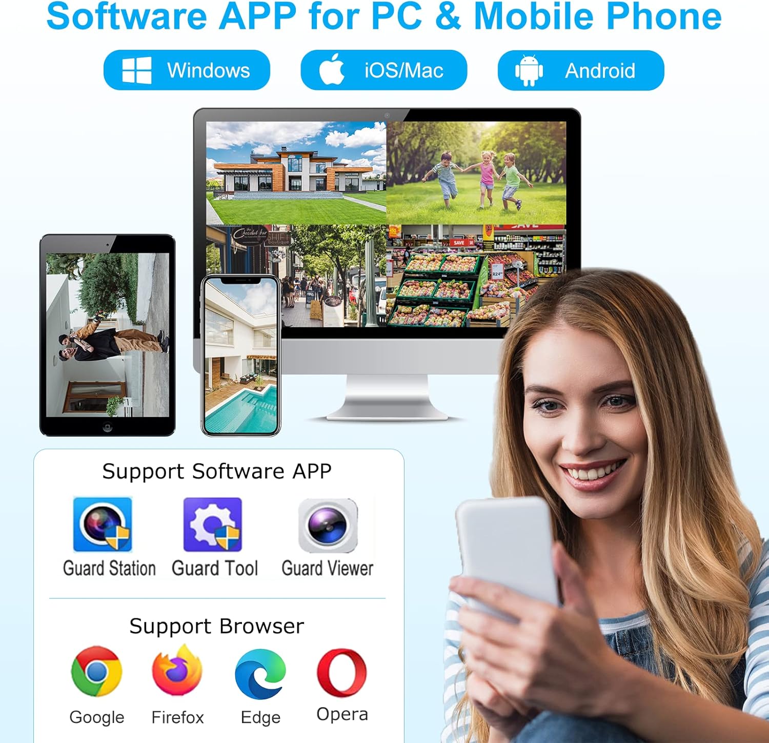 - Remote Access and Playback: The “Guard Viewer” app of NVR allows you to access all your PoE ip cameras remotely. You can remotely access your home or business at any time, anywhere from APP. Perform live views and playbacks on your smart device (iOS, Android). You can preview PoE camera via monitor/smart device/PC.