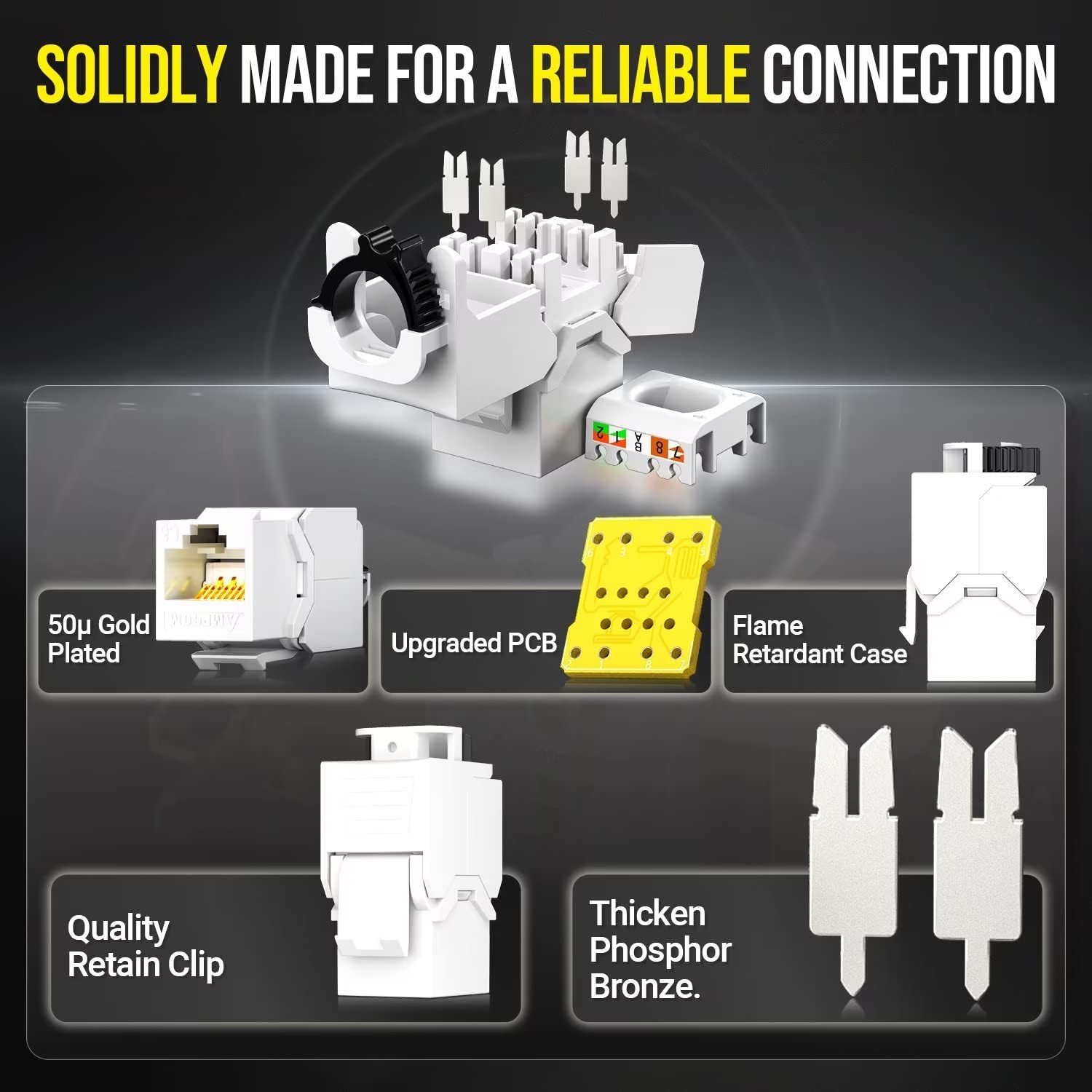 AMPCOM CAT6 RJ45 Keystone Jack - Reusable UTP Ethernet Wall Jack with Adjustable Ratchet Lock Design, No Tool and Zip Tie Required - 50u Gold Plated - White (2-Pack)