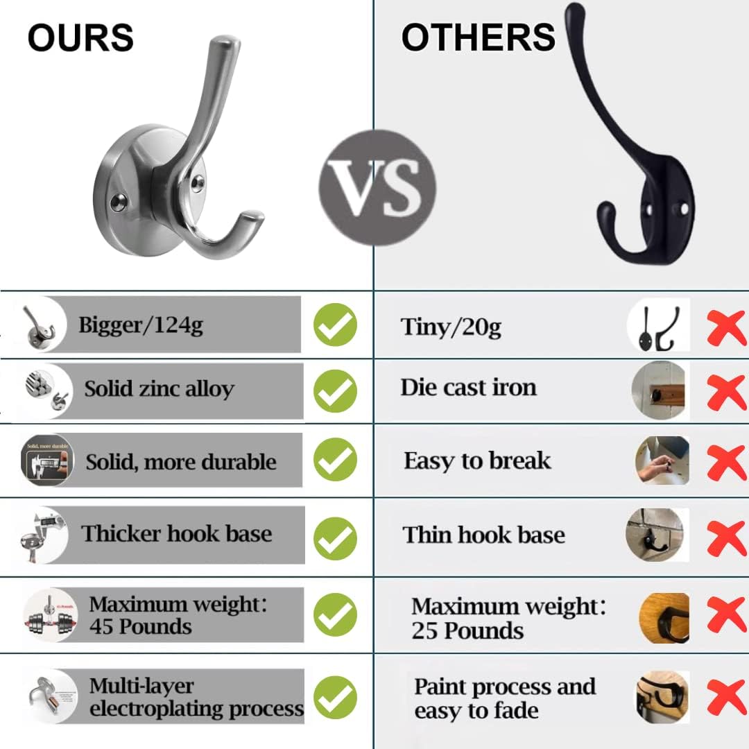- Rust-Proof: Our coats hooks are designed with a multi-layer electroplating process that makes them oil-proof and rust-proof, even in wet environments like bathrooms and kitchens.
