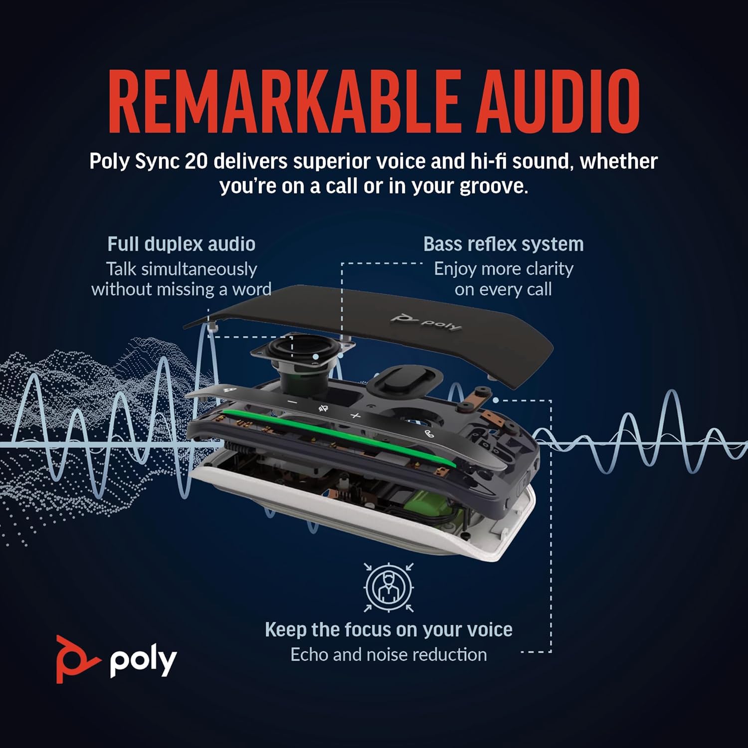 - WORK ON THE GO: Keep your smartphone charged and ready using your Poly Sync 20 personal Bluetooth speakerphone, featuring up to 20 hours of battery life. It’s slim and portable, IP64 dust-and water-resistant, and comes with its own carrying case.