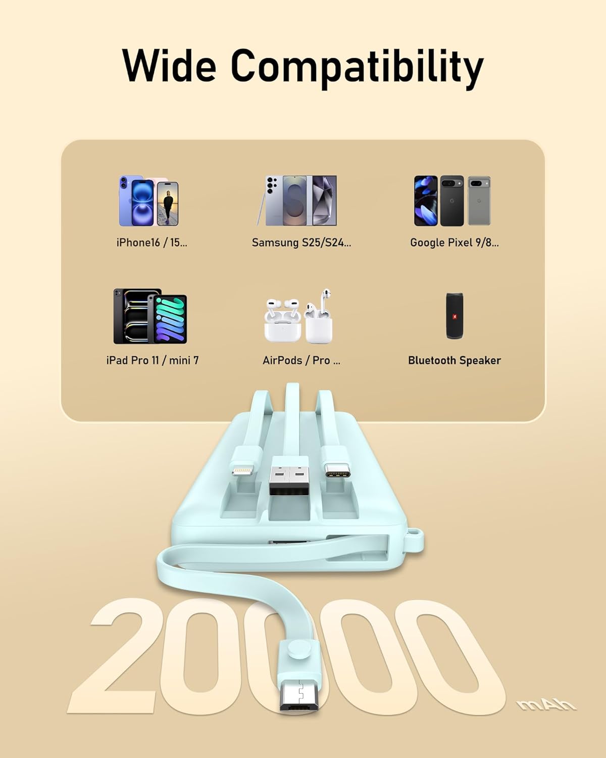 - [ Portable charger Built in Cables ] This built in cables portable charger power bank features built-in iPhone, USB-C, and USB-Micro cables, making it a one-stop solution. This portable charger power bank is universally compatible with popular smart devices, including the iPhone 16/15/14/13/12/11/8/7 series, XR, XS Max, Samsung Galaxy S24/S23/S22/S21/S10/S9/S8/Galaxy Z Flip/Z Fold/Galaxy A51/52/53/54/55/Note 20/10, Google Pixel series, and many more smartphones and USB-C devices