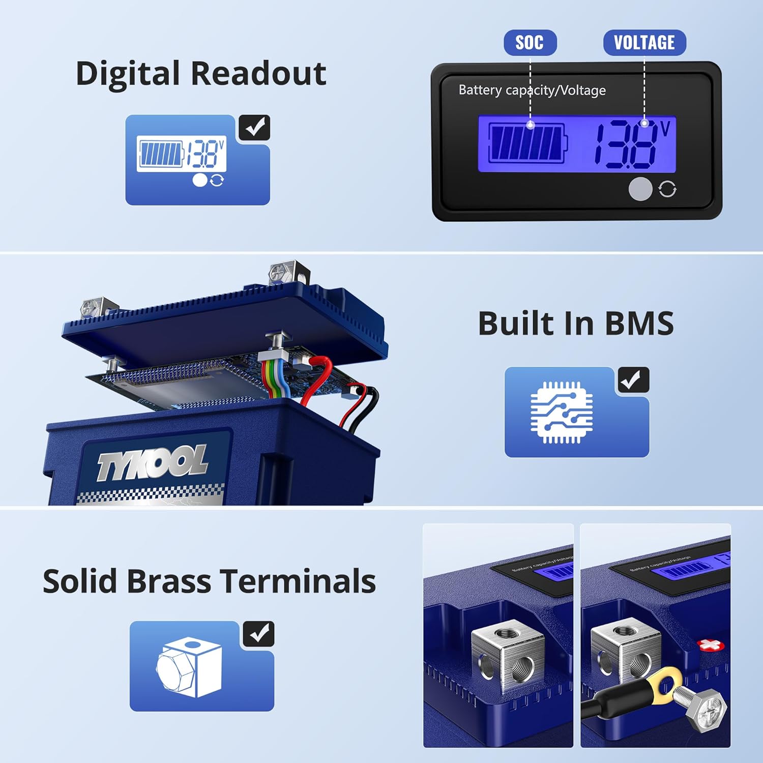 - Built Smart, Built Tough: Smart BMS actively guards against overcharge, extreme heat/cold, and short circuits. IP67 waterproof + digital voltage/SOC display for real-time battery health checks.