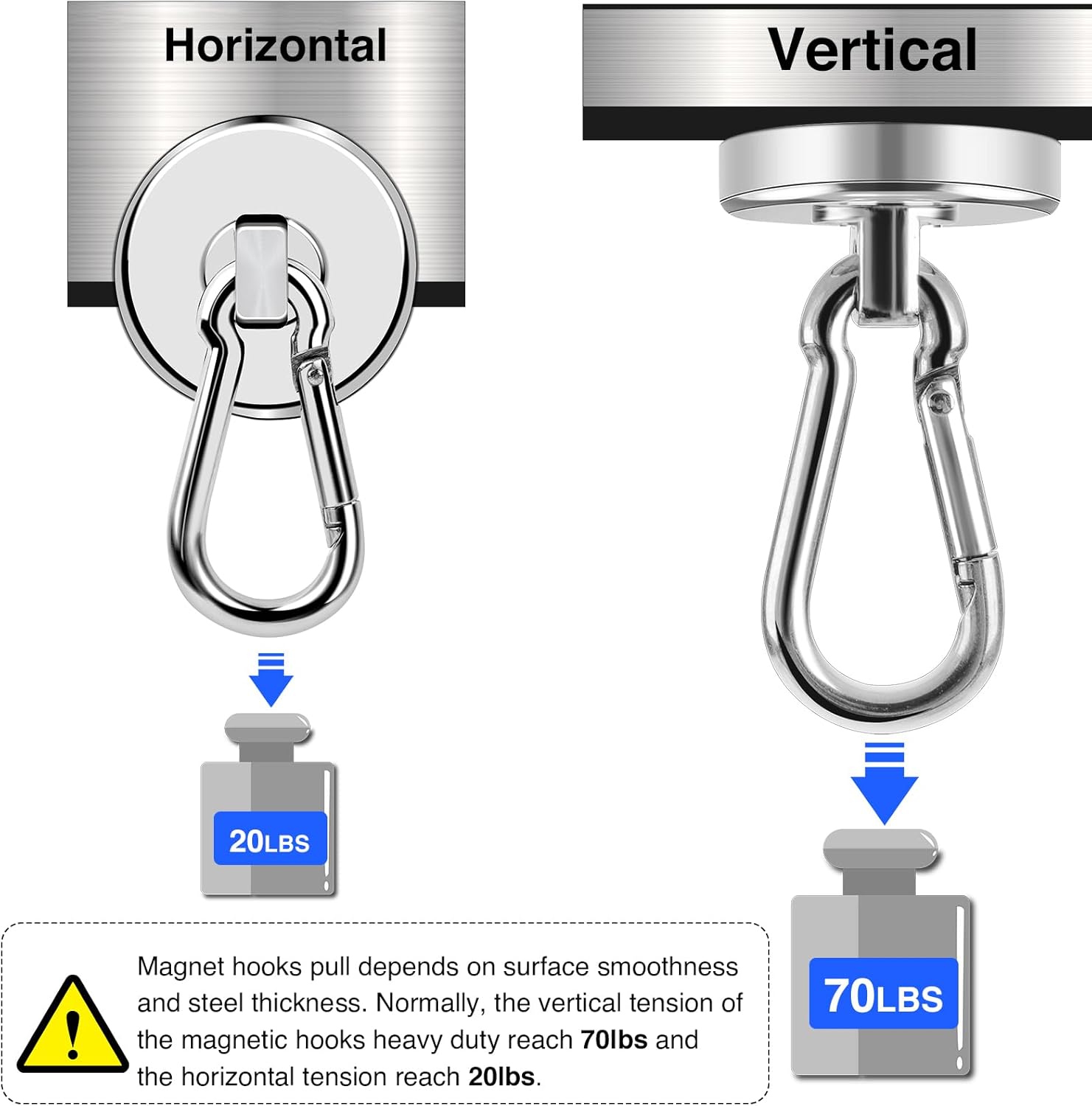 - 【STRONG MAGNETS】The strong magnetic hook has super strong suction, which can generally reach 70lbs when suspended vertically and 20lbs when suspended horizontally.The complimentary stainless steel carabiner hooks are more durable and last longer than aluminum buckles.