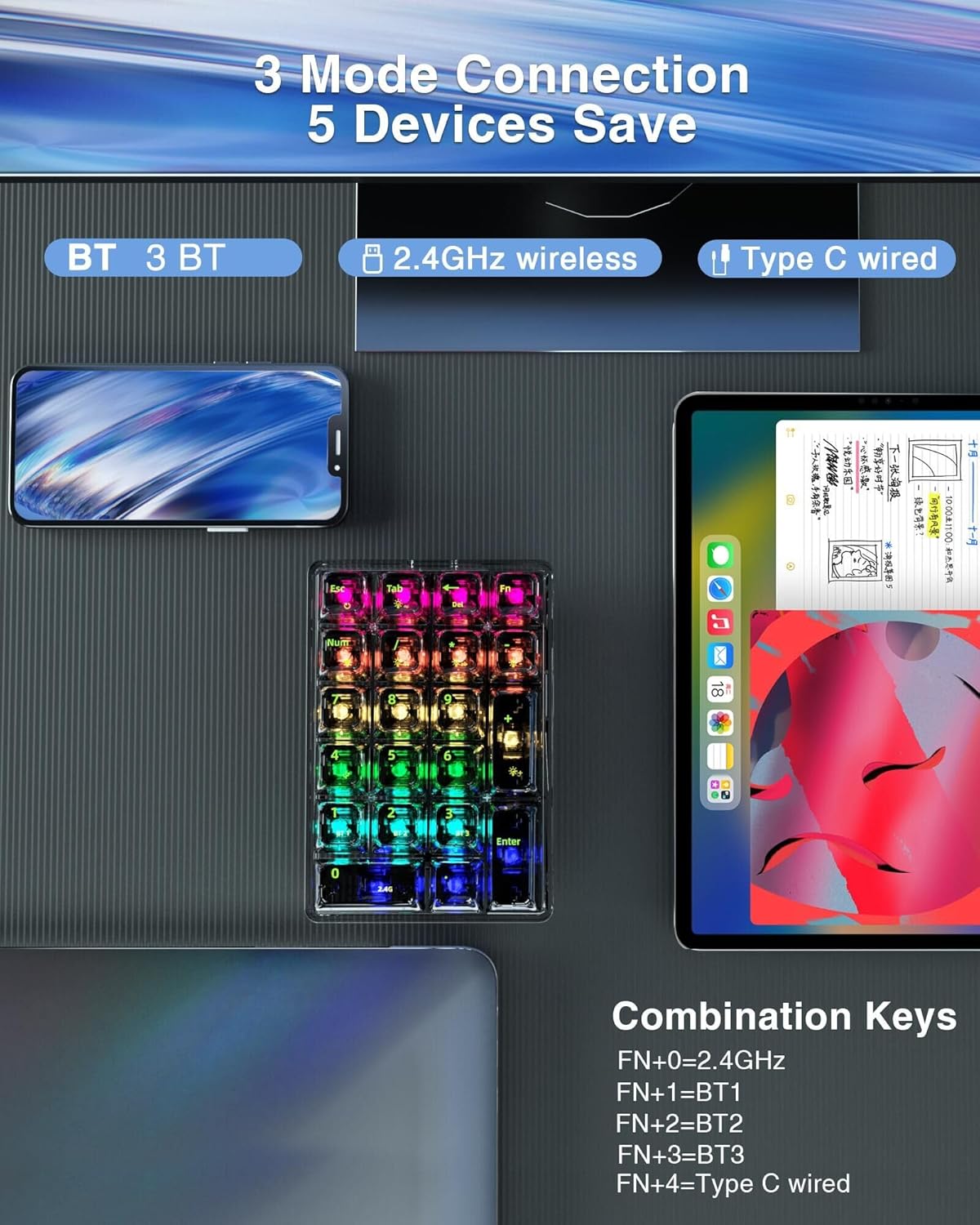 - Triple Modes connection:K21 Number Pad Supported 3 BT, 2.4GHz , type C wired 3 modes connection and supported save 5 devices same time.Easy switch and fast response!!This wireless Mechanical Mechanical Numpad Compatible with PC,Laptop,Macbook,Mobile Phones etc