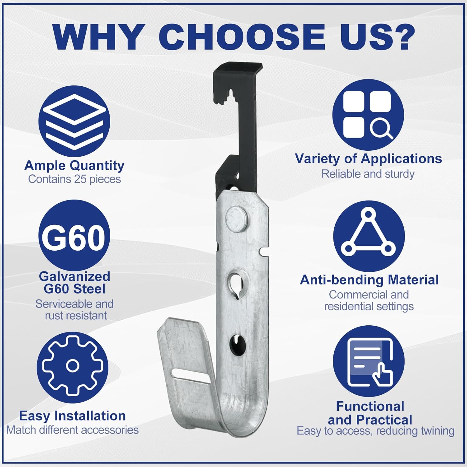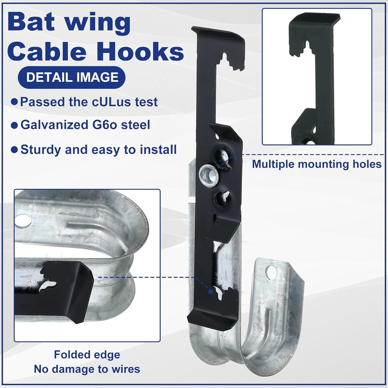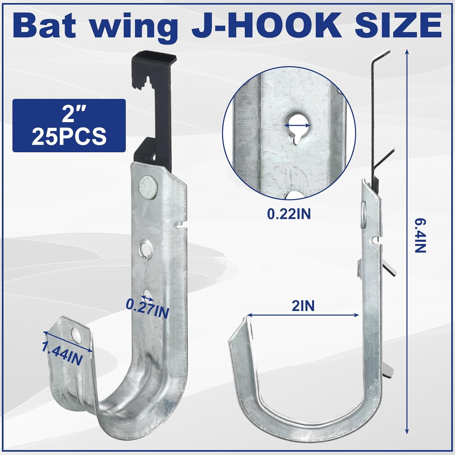 - Reliable and Quality: the J shape wire hooks for cables have passed CULUS test; Enjoy the quality and durability of the J hook hangers that are made from G60 galvanized steel, offering excellent resistance to rust and corrosion; The bat wing part uses 1.0 mm C1065 steel, and the finish is black E coating, ensuring stability once installed, offering reliable performance day in and day out