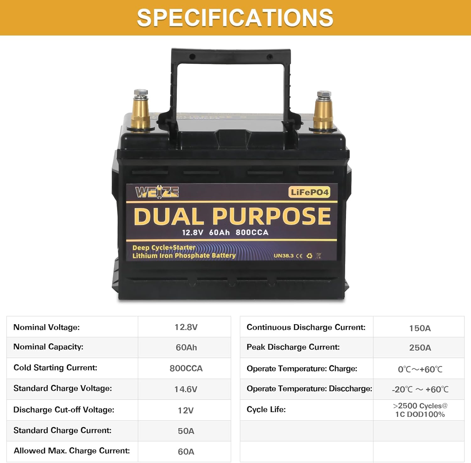 - ā DUAL PURPOSE : WEIZE lithium battery is built for starter and deep cycle performance which provides 800 CCA and a high continuous discharge rate, making it a great choice for high amp draw applications like run trolling motor. In addition, the 12V 60Ah provides the same legendary deep cycle marine performance, giving you lots of power for a long time. Includes a terminal adapter compatible with most marine, automotive, and deep cycle applications.