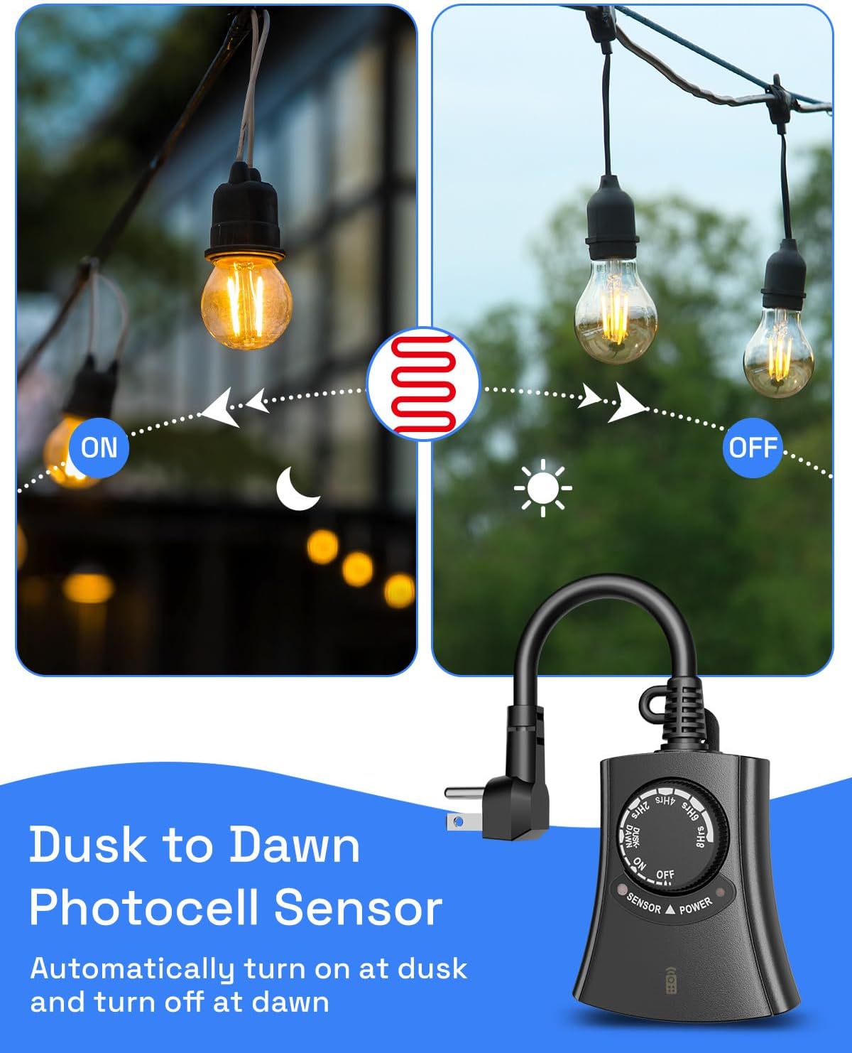- ✅【Photocell Light Sensor】The built-in light sensor automatically detects dusk and darkness, turning your lights on and off without manual intervention. Perfect for controlling outdoor equipment such as garden lights, Halloween landscape lights, Christmas string lights, pool pumps, fountains, and more.