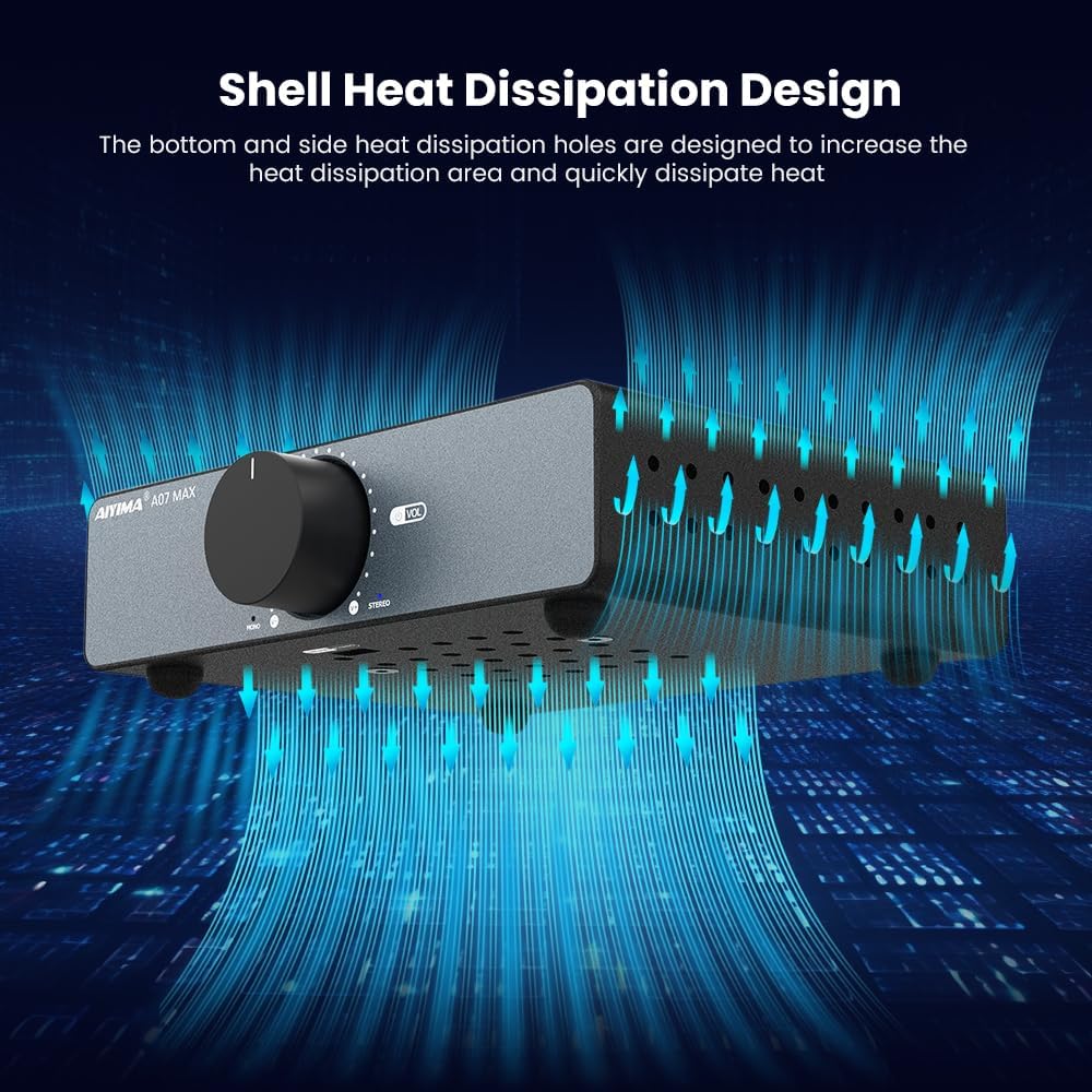 - ❶【300W+300W Stereo Amplifier mode】Dual function switchable Stereo/Mono 300W/600W amplifier.AIYIMA A07 MAX Power Amplifier can use as a 2 Channel Audio Component amplifier for Passive Bookshelf Speakers Desktop Home Theater,the max output power up to 600Watts(300W *2 under@4 ohm), can drive 2-8Ω speakers, providing spacious and clean sound quality. Its compact size makes it suitable for a variety of applications, easily setting up your bookshelf/desktop/home theater.The AIYIMA A07 Max is the best match on the market for different types of speakers and the sound quality of the A07 Max is excellent