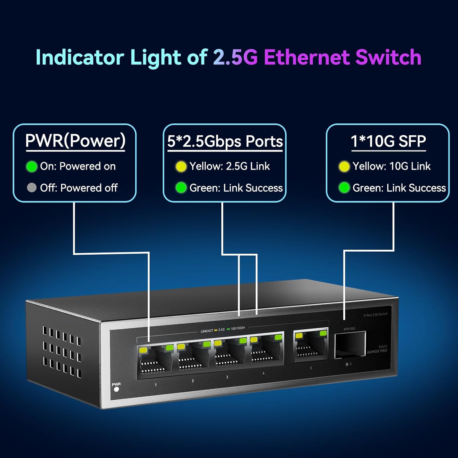 6 Port 2.5Gb Unmanaged Ethernet Switch with 5* 2.5G Base-T Ports, 1*10G SFP Ports, AUMOX PRO 60Gbps Switching Capacity Compatible with 100/1000/2500Mbps Plug and Play